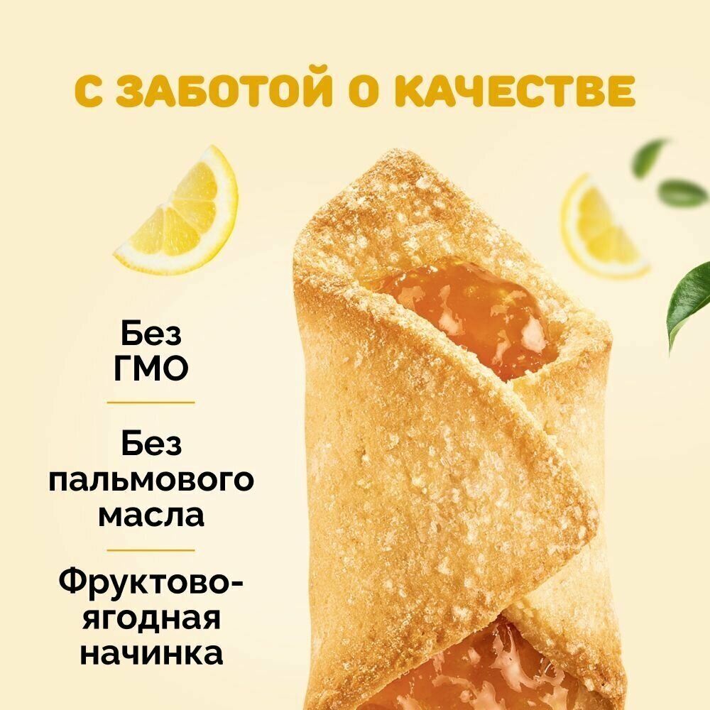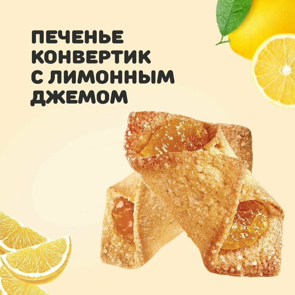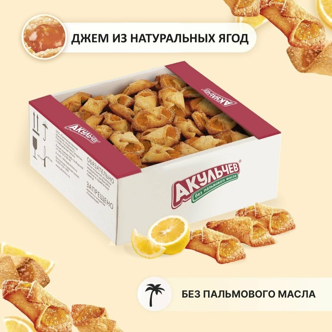 Сдобное печенье от бренда Акульчев попросту не может не привлечь к себе внимание. Обусловлено это далеко не только его восхитительным ароматом и изысканными вкусовыми качествами. Непреодолимое желание попробовать эти вкусняшки возникает по причине их необычной формы. Кондитерские изделия изготовлены в виде миниатюрных конвертиков, которые наполнены натуральным лимонным джемом. Они безумно нежные и мягкие, навевают воспоминания о детстве. Вполне естественно, что эти вкусности не оставят равнодушными ни маленького ребенка, ни взрослых женщин и мужчин. Поэтому особой популярностью они пользуются среди детской и женской аудитории. С этим набором свежей продукции легко удастся разнообразить рацион питания, поднять настроение и утолить голод. Это превосходный гостинец для близких и отличный подарок коллегам в честь любого праздника. Красивые сладости непременно понравятся каждому ценителю классики. Печеньки находятся в оригинальной упаковке в виде классической коробочки. Эта выпечка станет лучшим решением для легкого завтрака в домашних условиях и перекуса в дороге.