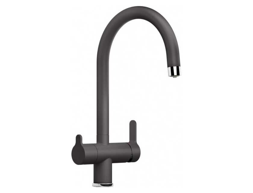 Однорычажный смеситель Blanco Trima (темная скала). Смеситель с фильтром вращающимся на 360 гр. изливом, керамический дисковый картридж. Совмещенный излив для обычной и питьевой воды. Современный смеситель с фильтром Эргономичные системы управления, подключение фильтра Отдельные рычаги управления для фильтрованной и нефильтрованной воды Один совмещенный излив для питьевой и обычной воды с разделением рассекателя Вращающийся на 360° излив увеличивает функциональность Высота: 373 мм. Длина излива: 205 мм. Предлагается в 10 цветах Silgranit, а также в исполнении хром и нержавеющая сталь UltraResist Комплектация Вращающийся излив Требуется отверстие под смеситель Ø 35 мм Керамический дисковый картридж Легкое подключение гибкими шлангами длиной 450 мм с гайкой ?' Запатентованный рассекатель, уменьшающий отложения налета от воды Стабилизирующая пластина для увеличения устойчивости смесителя