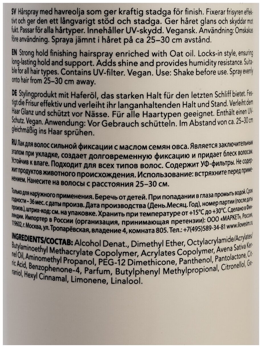 | Состав | Аlcohol denat., dimethyl ether, octylacrylamide/acrylates/butylaminoethyl methacrylate copolymer, acrylates copolymer, avena sativa kernel oil, aminomethyl propanol, PEG-12 dimethicone, panthenol, pantolactone citric acid, benzophenone-4, parfum, butylphenyl methylpropional, citronellol, geraniol, hexyl cinnamal, limonene, linalool |