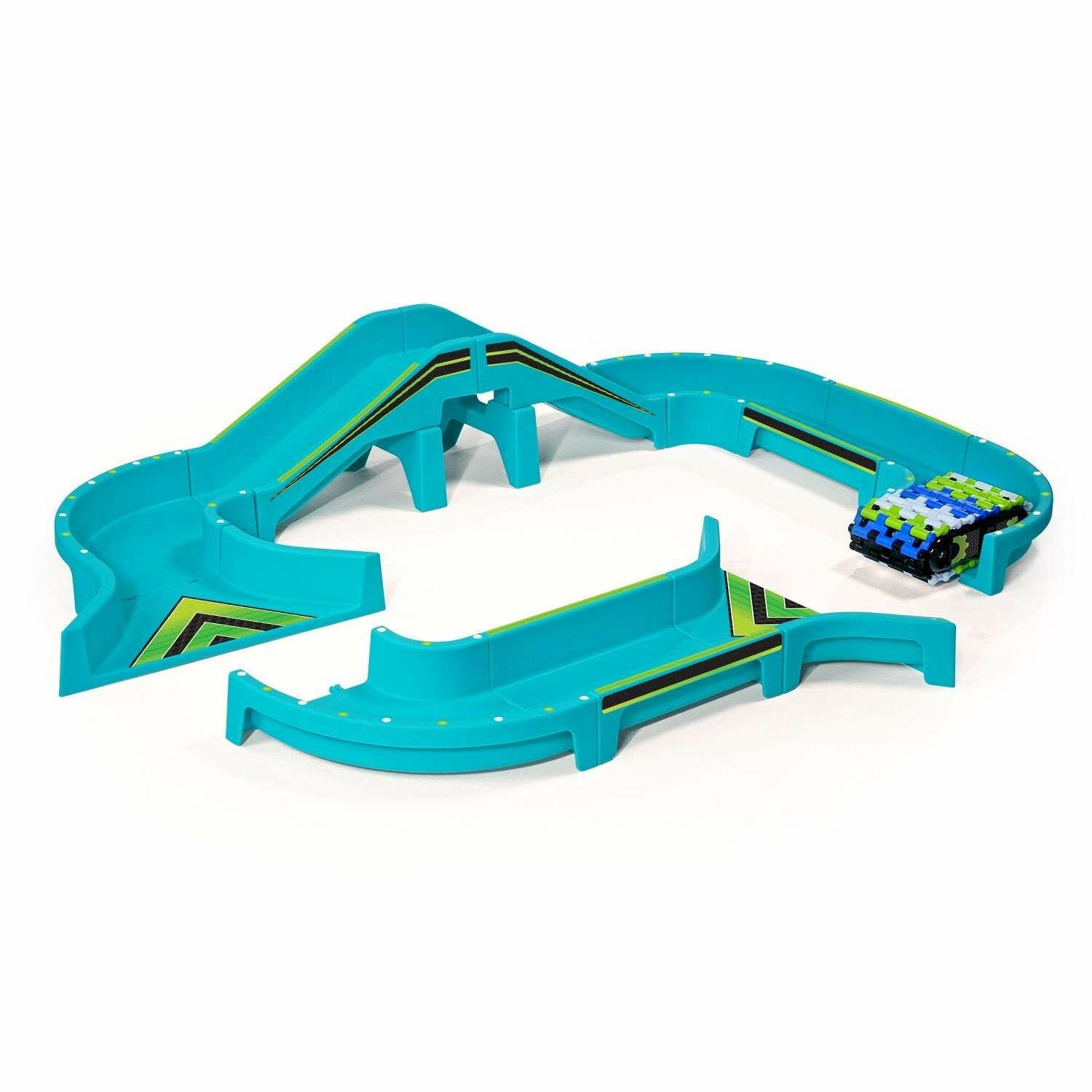 Построй необычный вездеход из скользящих пластин 4-х оттенков – синего, белого, черного и зеленого, заряди его батарейки. Построй из отдельных элементов крутую трасу с подъемами, спусками, тоннелями и барьерами, используй любые аксессуары для маневрирования. Маршруты трассы можно менять в любое время.