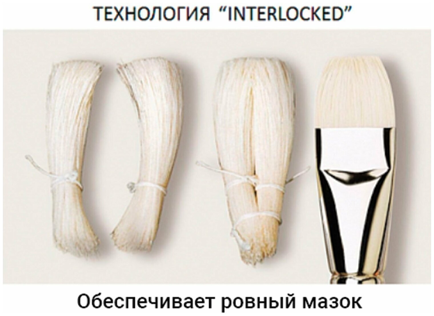 Ворс кисти выполнен по технологии «interlocked», которая заключается в смыкании двух пучков щетины к центру (в процессе обвязки), что позволяет ворсу долго удерживать первоначальную форму, не распушаясь при контакте с холстом.