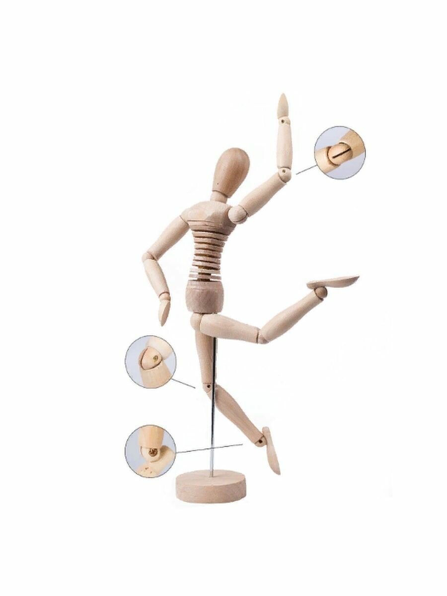 Манекен человека представляет собой деревянную куклу, сочленения которой, в месте расположения основных суставов, закреплены на специальных шарнирах. Такие соединения предоставляют возможность зафиксировать манекен в необходимом положении или позе. Данный манекен изготовлен из древесины.