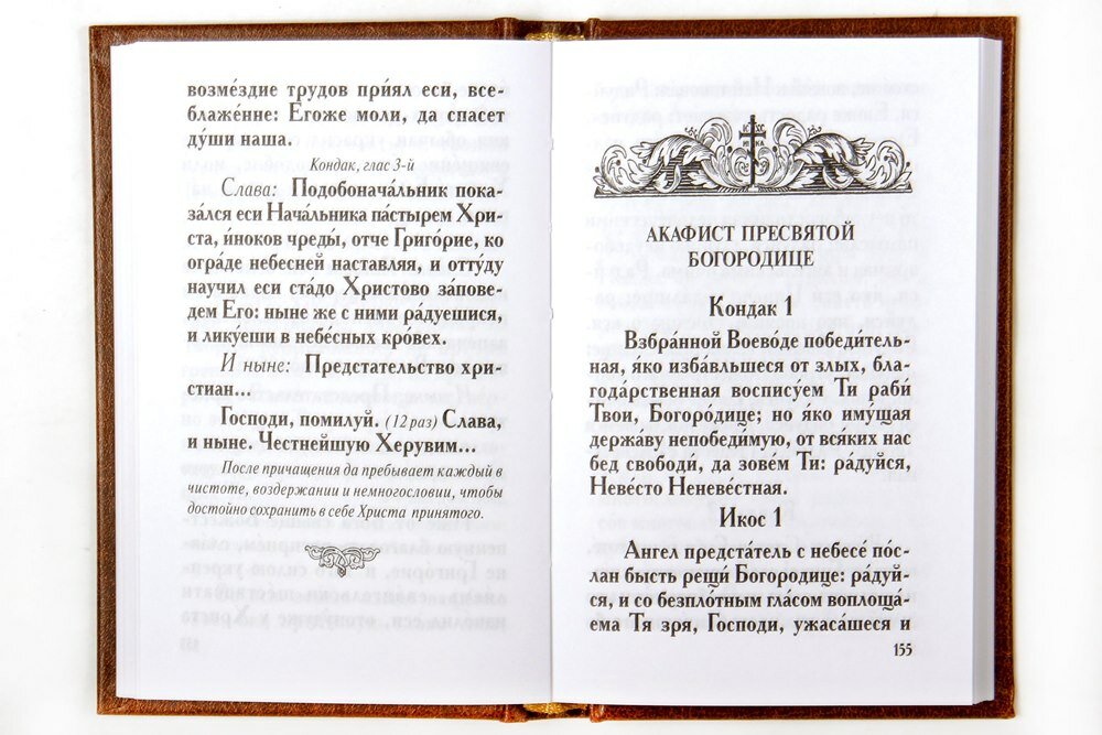 Книга содержит: Молитвы утренние; Молитвы на сон грядущим; Три канона с акафисты: Иисусу Сладчайшему, Последование ко Святому Причащению; Благодарственные молитвы по Святом Причащении; Акафист Пресвятой Богородице; Тропари,кондаки и величания; Молитвы разные; Молитвы некоторым святым; Чие пения дванадесяти псалмов; Канон за болящего.