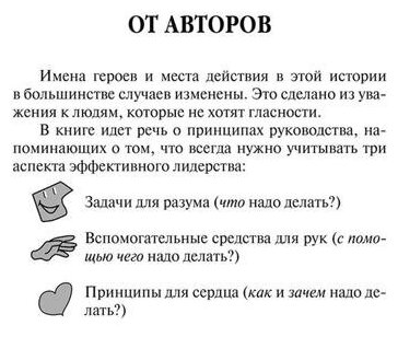 Книга читается как увлекательный роман и представляет читателю предельно четкую и ясную стратегию, которая в самом доступном для восприятия формате раскрывает все аспекты эффективного руководства людьми: