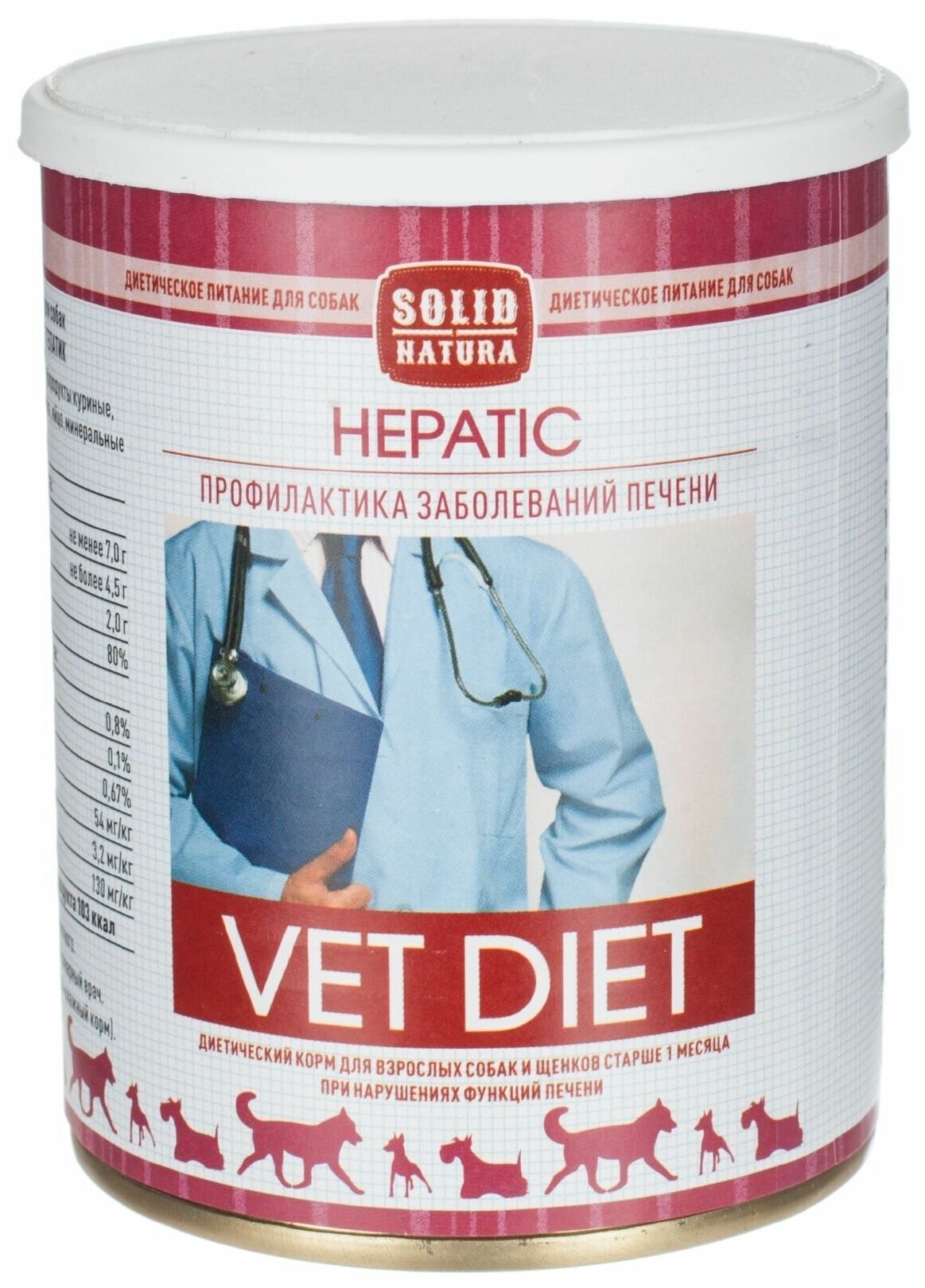 Solid Natura VET Hepatic - это влажный диетический корм, предназначенный для собак всех пород и возрастов при нарушениях функции печени. По ингредиентному составу относится к кормам суперпремиум класса.