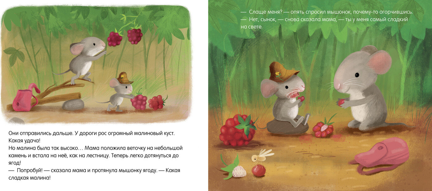Мама мышка и ее мышонок отправляются на прогулку по лесу — слушать чудесное пение птиц и собирать сладкие ягоды. И для мамы нет ничего важнее и никого любимее на свете, чем ее маленький сынишка.