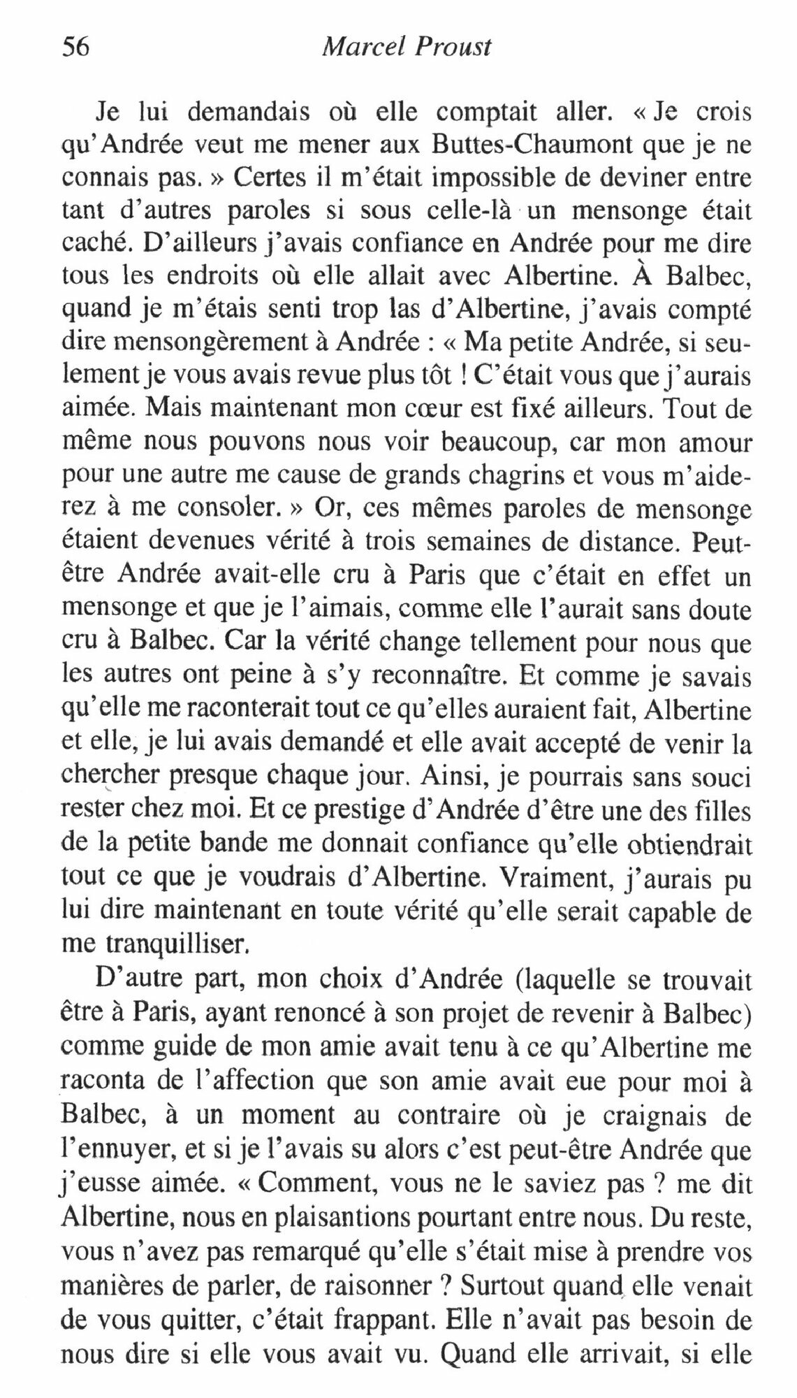 Albertine a renonce a faire une croisiere et lorsque, a la fin de l’ete, elle rentre de Balbec avec le narrateur, elle s’installe chez lui, a Paris: il ne se sent plus amoureux d’elle, elle n’a plus rien a lui apprendre, elle lui semble chaque jour moins jolie, mais la possibilite d’un mariage reste ouverte, et en lui rendant la vie agreable, peut-etre songe-t-il a eveiller en elle le desir de l’epouser. Il se preoccupe en tout cas de son emploi du temps, l’interroge sur ses sorties sans pouvoir bien percer si sa reponse est un mensonge, et le desir que visiblement elle suscite chez les autres fait poindre la souffrance en lui. Paru en 1923, La Prisonniere est le premier des trois volumes publies apres la mort de Proust et, quoique solidaire, bien sur, de Sodome et Gomorrhe qui le precede comme d’Albertine disparue qui le suit, une certaine unite lui est propre, entre l’enfermement initial du narrateur et le depart final de la jeune fille. Pour l’essentiel, trois journees simplement se deroulent ici –le plus souvent dans l’espace clos de l’appartement –, et ce sont comme les trois actes d’un theatre ou la jalousie occupe toute la place.