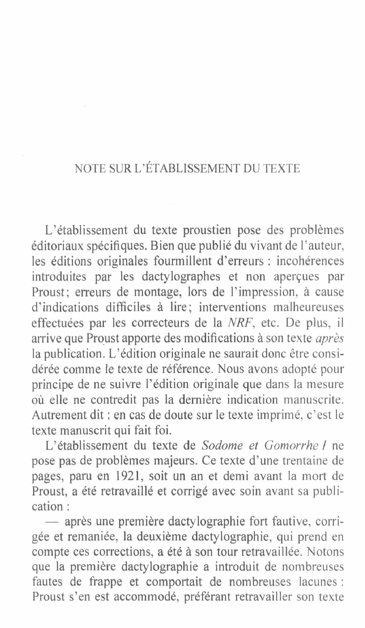 Marcel Proust est probablement le premier des grands ecrivains qui ait franchi les portes de Sodome et Gomorrhe en flammes. Il songea d'ailleurs a donner le nom des deux cites bibliques a l'ensemble de son oeuvre- l'objet veritable de son etude n'est pas l'idealisation d'une passion singuliere ni l'explication philosophique de son mystere ni la psychologie amoureuse de ses desservants - psychologie qui obeit simplement aux lois generales de l'amour. C'est le portrait vivant, incarne par le plus hautain des seigneurs, de « l'homme traque » par la societe, en revolte latente contre elle, c'est la lutte de la nature contre la morale. Leon PIERRE-QUINT. Sodome, c'est M. de Charlus et Gomorrhe Albertine. Entre ces deux figures, chacune etant le centre d'une tragi-comedie dont le spectateur ne fait que percevoir les echos meles, le heros du livre, celui qui parle a la premiere personne, poursuit son voyage a la recherche du temps perdu. Roger Allard, N.R.F., juin 1992.
