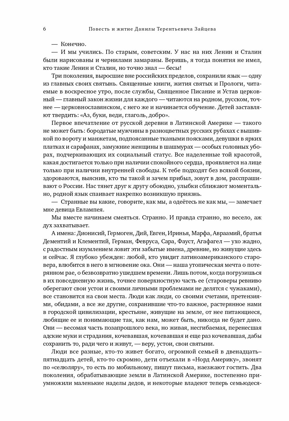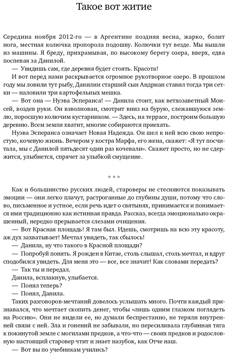 Но главное в книге — рассказ о повседневной жизни русских людей, живущих по стародавним заветам, ради соблюдения которых они, как и положено верующим христианам, готовы переносить страдания, терпеть нищету и лишения. И еще: на русском диалектном языке, который во всей своей первозданной силе звучит в книге, и сегодня говорят староверы Южной Америки.