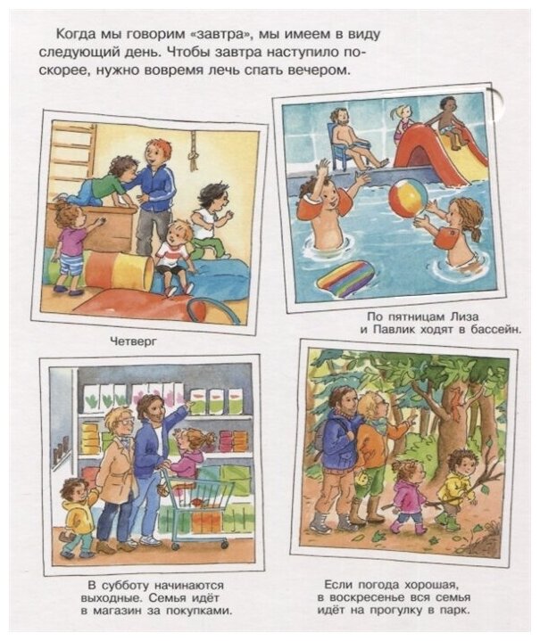 На каждом книжном развороте внимание любознательного малыша привлекут красочные сюжетные иллюстрации периодически повторяющихся событий, связанных с повседневной жизнью каждого человека в разные интервалы времени.