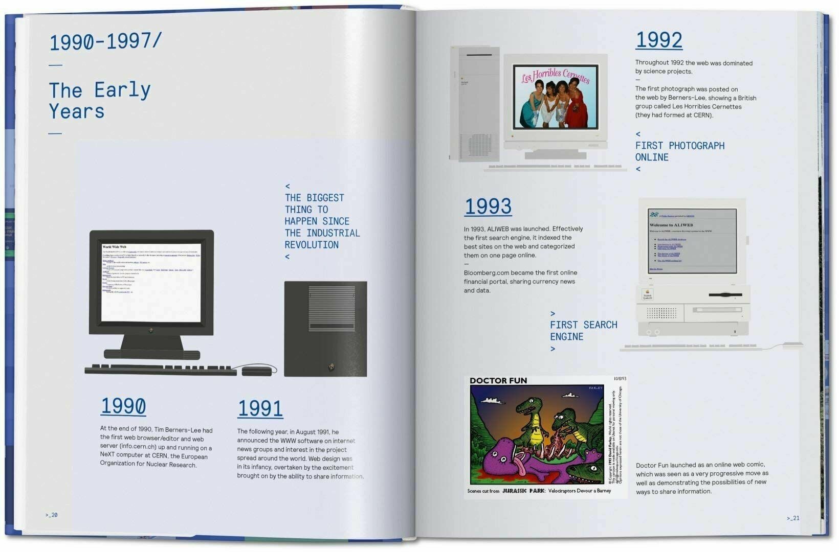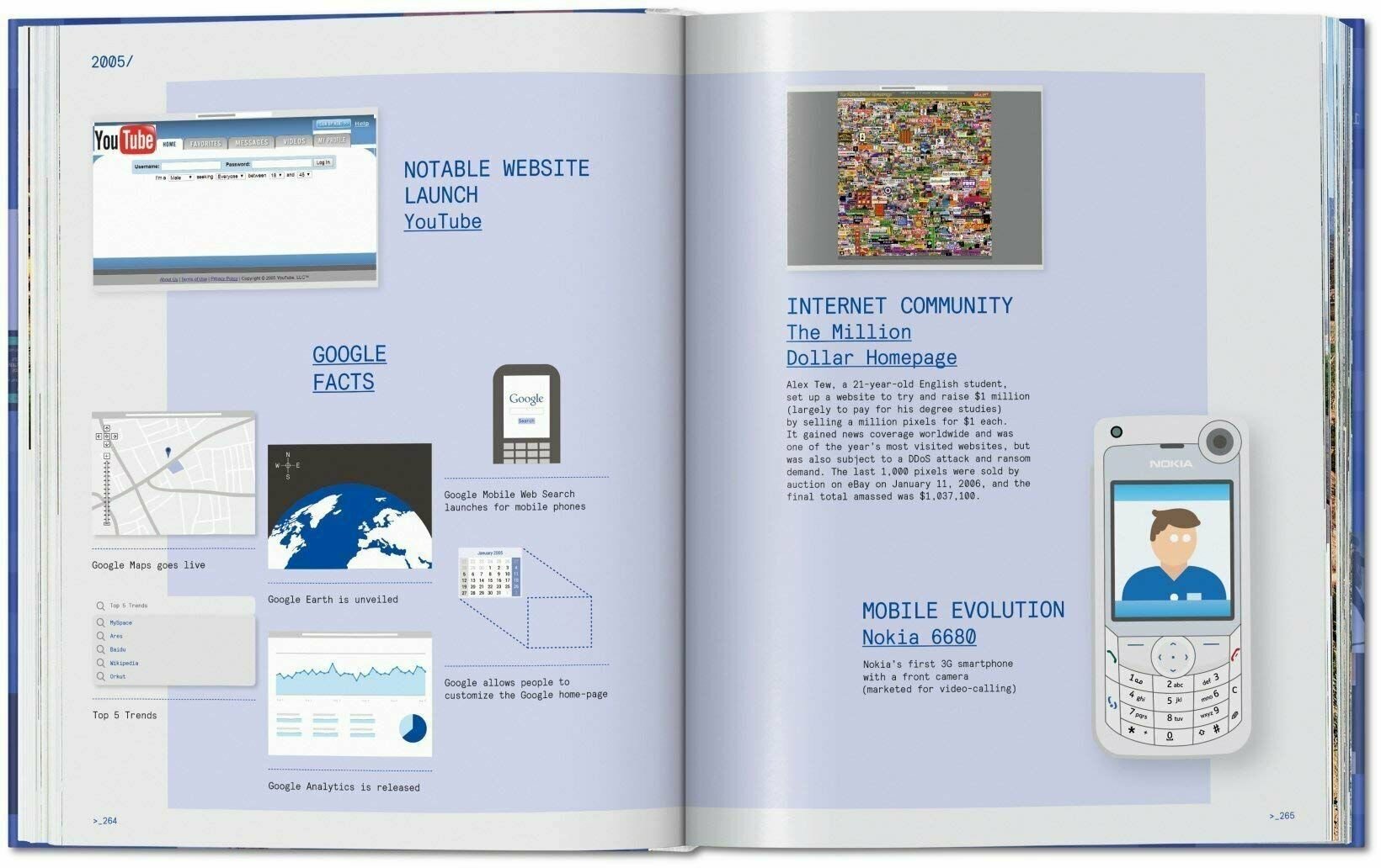 Since its debut in 1990, the internet has seen over a billion web pages—but it wasn’t always sleek interfaces. In this visual tour through history, trace the very earliest examples of what we today take for granted, from the first website to use surround sound to the first ‘upload-your-face’ function and YouTube-like page. Complete with year-by-year factsheets, Google insights, and commentary from the creators themselves. Multilingual Edition: English, French, German