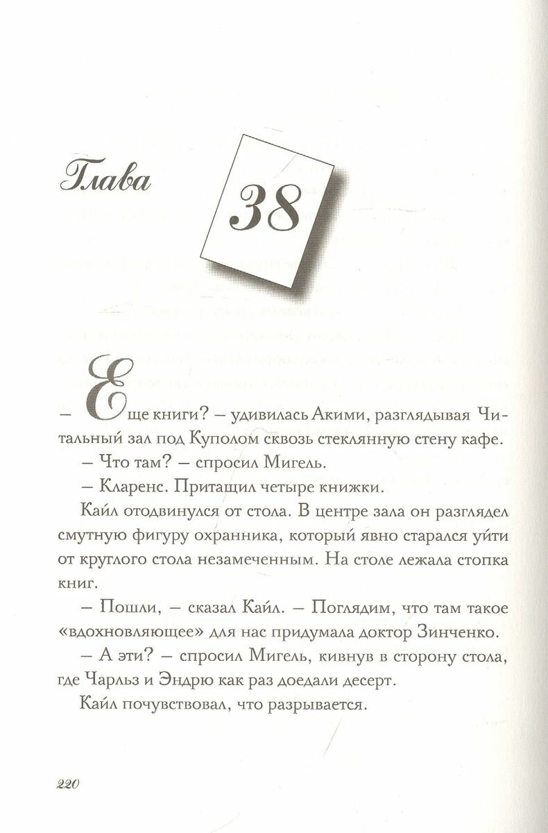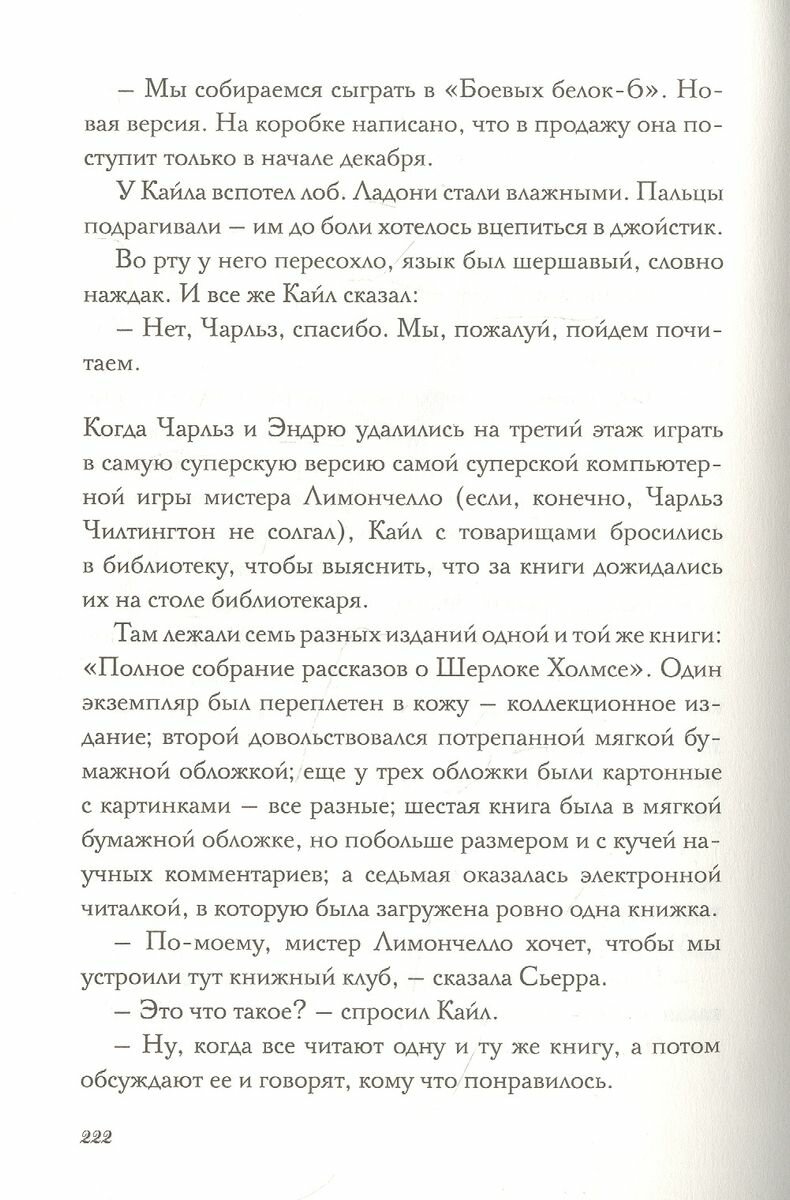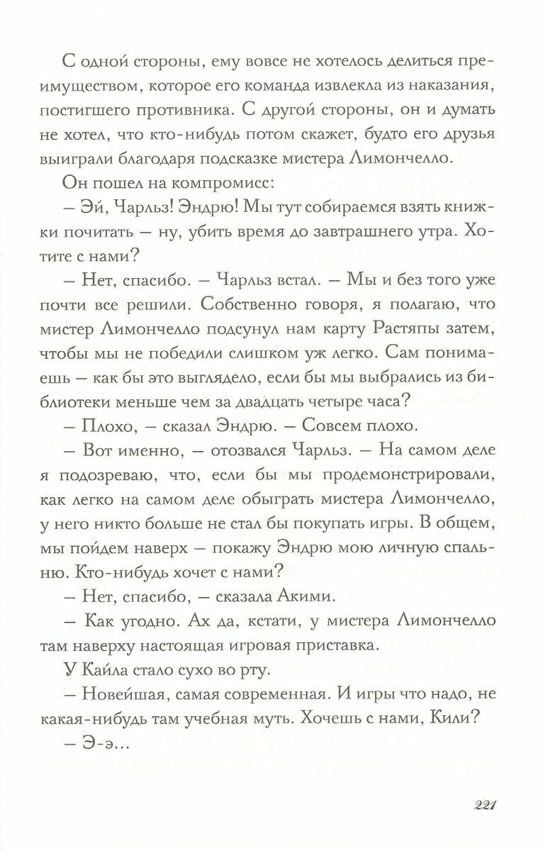 12-летний Кайл и его одноклассники даже подумать не могли, чем обернется праздник по случаю открытия новой библиотеки. Великий Луиджи Лимончелло, непревзойденный придумщик компьютерных и настольных игр, сделал так, что, оказавшись в библиотеке, ребята оказались в настоящей игре: победит тот, кто первым выберется через потайной выход из библиотеки. Но где он, этот выход? У Кайла и его друзей есть ровно 24 часа и шифрованные подсказки – они ловко спрятаны буквально повсюду: в книгах, в архивных коробках, на потолке и даже на читательских билетах. Чем же закончится ночь в библиотеке?