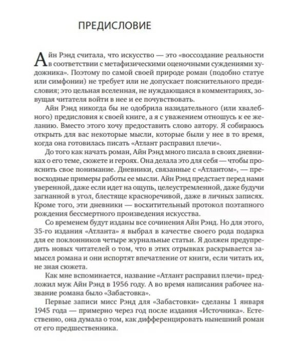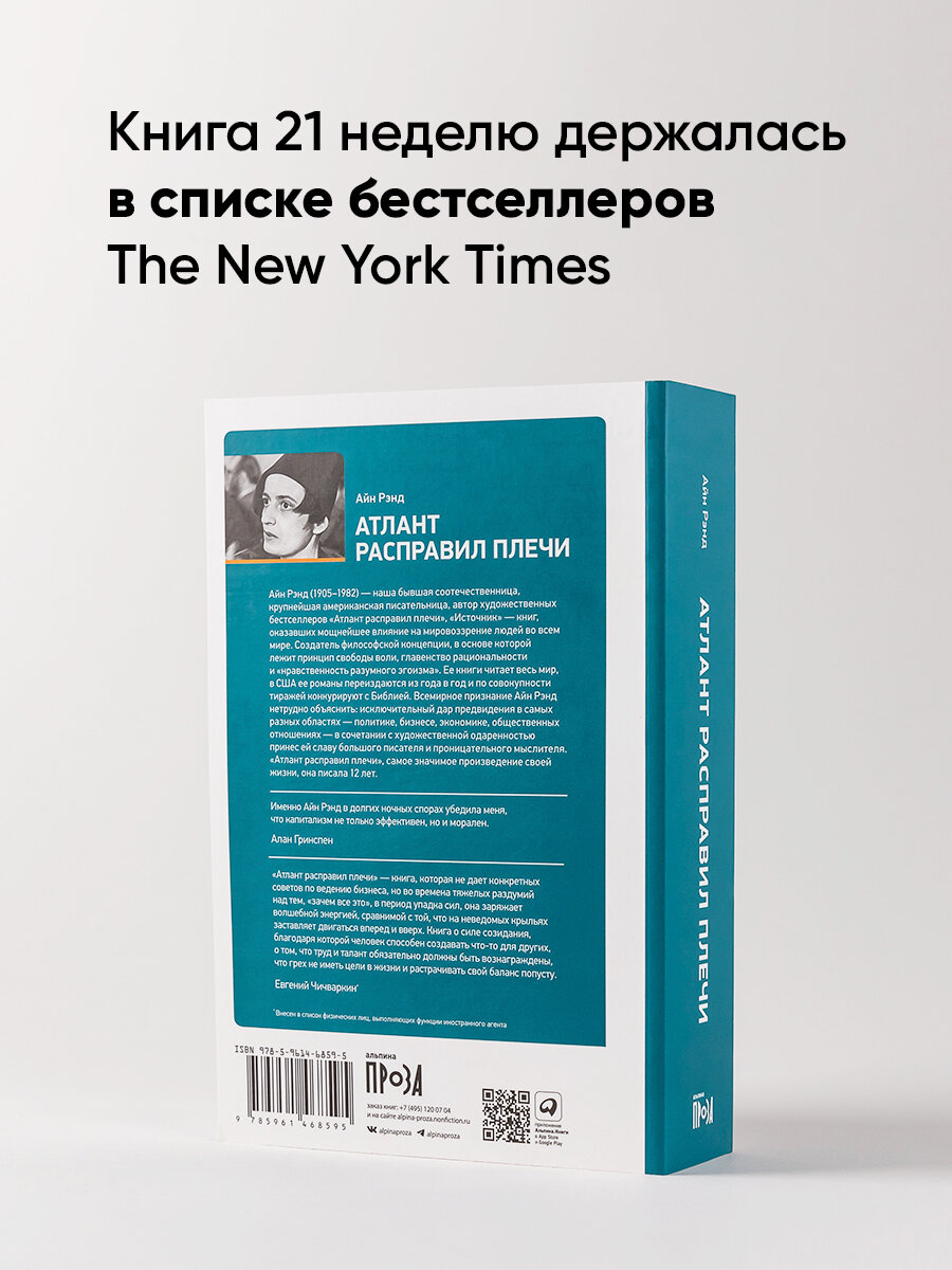 .Ее книги читает весь мир. В США она завоевала огромную популярность, ее романы переиздаются из года в год и по совокупности тиражей конкурируют с Библией. Всемирное признание Айн Рэнд нетрудно объяснить: исключительный дар предвидения в самых разных областях - политике, бизнесе, экономике, общественных отношениях - в сочетании с художественной одаренностью принесли ей славу большого писателя и проницательного мыслителя. "Атлант расправил плечи", самое значимое произведение своей жизни, она писала 12 лет.