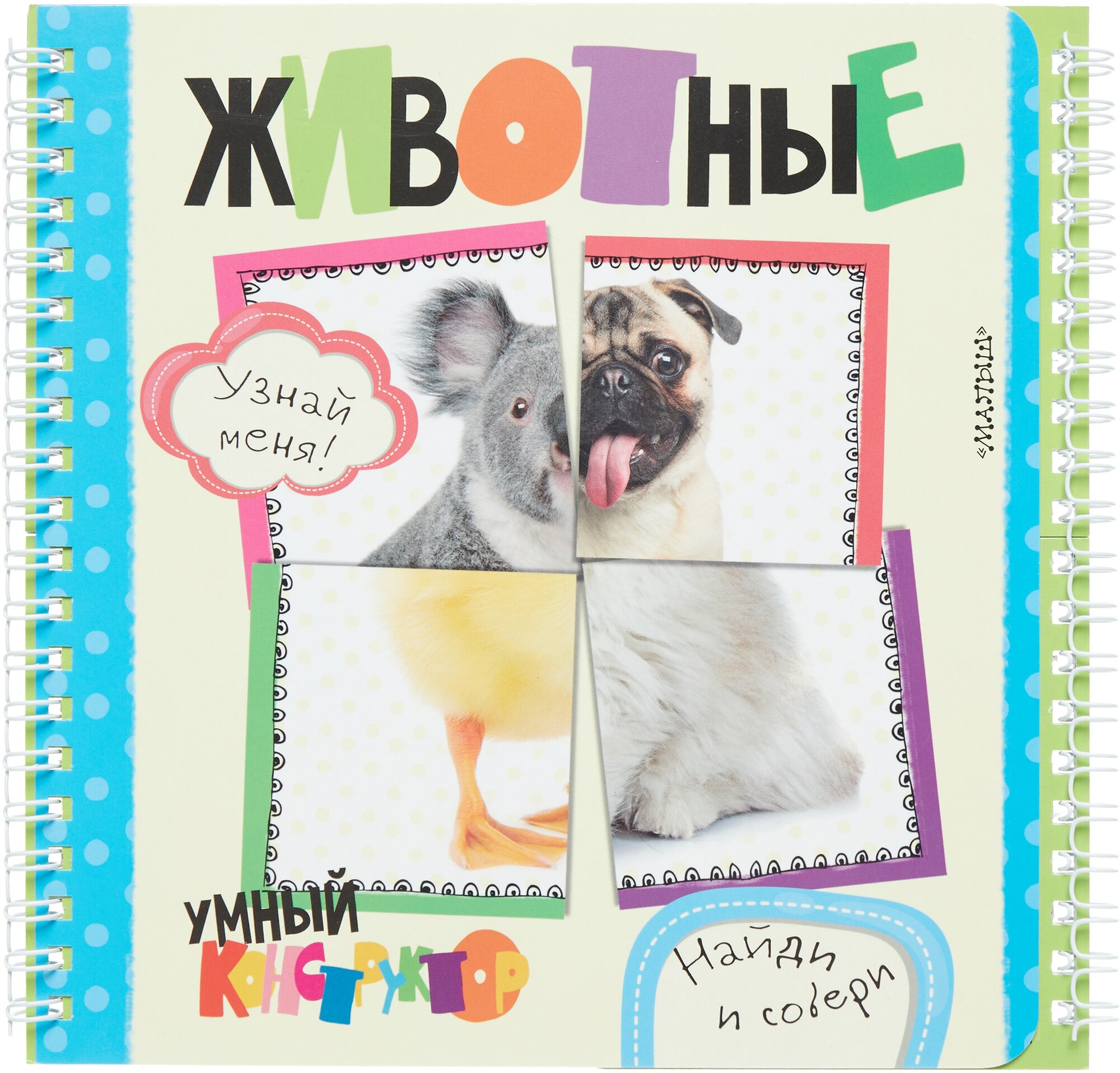 Книжка-мозайка квадратной формы. Внутри картинки поделены на 4 части и закреплены на пружину по типу календарной. Перебирая каждую из 4 стопок, ребенок должен собрать картинку животного из 4 частей. Картинки 2-сторонние. Представлены дикие и экзотические звери и домашные питомцы.