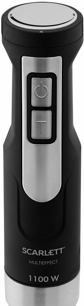 Погружной блендер Scarlett оснащён мощным мотором высокой мощности 1100 Вт, к нему прилагается мини-измельчитель, мерный стакан и венчик, с помощью которых можно измельчать продукты, готовить тесто, взбивать крем, выполнять другие задачи.