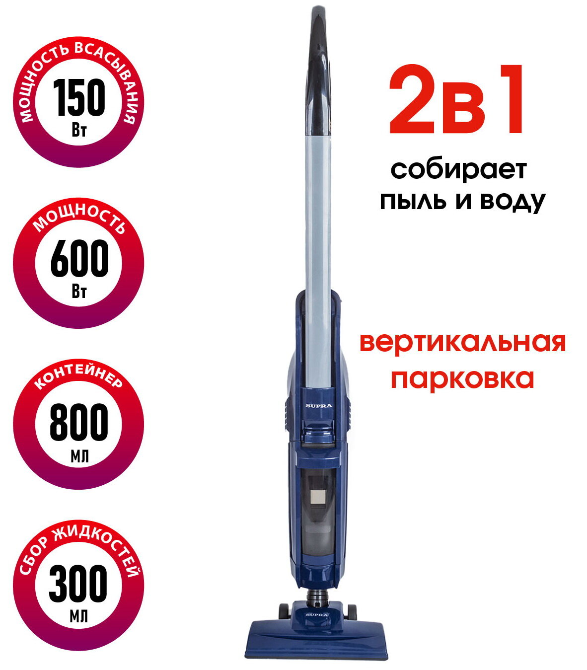 | Прочие особенности и свойства | Ручной пылесос Supra VCS-5099 предназначен не только для сухой уборки, но и для сбора разлитой жидкости, для которой предусмотрен отдельный резервуар.,,ДЛЯ РЕШЕНИЯ СЛОЖНЫХ ЗАДАЧ,Мощность всасывания 150 Вт и циклонный фильтр дают устройству возможность эффективно справиться с пылью и мелким мусором. Загрязнения попадают в 0,8-литровый контейнер, который после заполнения можно легко отсоединить, чтобы вытряхнуть содержимое в ведро, а затем вернуть на место.,,УДОБНО ПОЛЬЗОВАТЬСЯ,4,5-метровый сетевой шнур обеспечивает большой радиус действия. Продуманная конструкция позволяет хранить устройство в вертикальном положении, чтобы сэкономить место в квартире. |