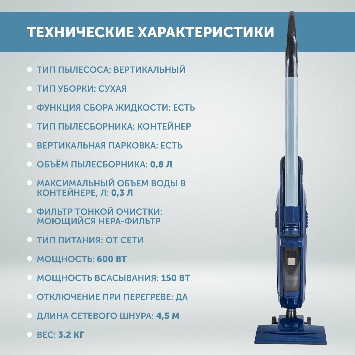 | Тип пылесоса | вертикальный проводной |