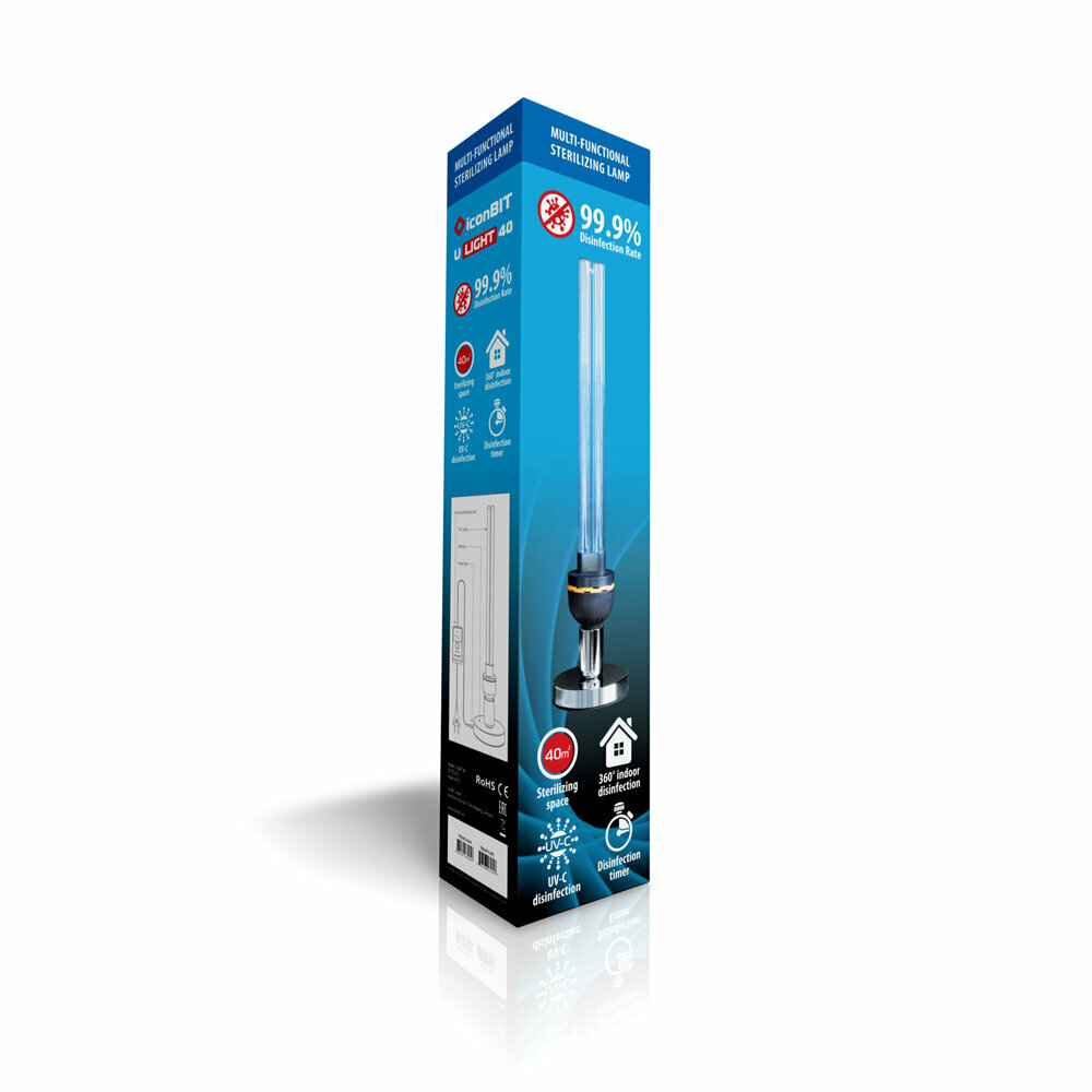 U LIGHT 40 — это стерилизатор , используемый для подавления жизнедеятельности вирусов и микроорганизмов.Его принцип действия основан на воздействии УФ излучения и озона , которые уничтожают ДНК микробов , убивая их таким образом.UV-C излучение и озон — мощное средство против невидимой угрозыЭффективное противомикробное комбинированное воздействие UV-C излучения и озона обеспечивает полное уничтожение инфекций и вирусов в обработанном помещении. Принцип УФ стерилизации Коротковолновое ультрафиолетовое излучение УФ-С уничтожает ДНК бактерий и вирусов , что приводит к снижению жизнеспособности и способности микроорганизмов к размножению. Принцип стерилизации озоном Присутствие озона приводит к повышению уровня стерилизации и дезинфекции. Он способен проникать в места , недоступные УФ-излучению, и удалять формальдегид из воздуха путем его диссоциации на кислород , воду и диоксид углерода.Отложенный стартU LIGHT 40 включается через несколько секунд после нажатия кнопки питания. Это позволяет безопасно установить УФ-лампу и выйти из комнаты до начала дезинфекции.ТаймерiconBIT U LIGHT 40 обеспечивает 4 режима стерилизации и дезинфекции: 5мин ( 4м 2 ), 15м