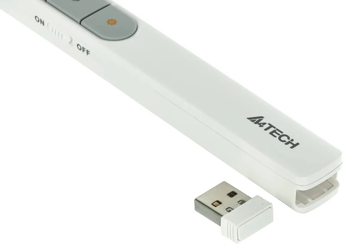 Пульт для презентаций A4tech Fstyler LP15 является удобным аксессуаром для показа мультимедийных презентаций. В изделии предусмотрены две клавиши для перелистывания слайдов презентации и одна кнопка для включения встроенной лазерной указки, с помощью которой можно привлекать внимание зрителей к определенным элементам слайда. Взаимодействие портативного пульта с ПК или ноутбуком, к которому присоединен проектор для показа презентаций, осуществляется за счет миниатюрного USB-ресивера. Связь между изделием и ресивером поддерживается на расстоянии до 15 м. Пульт ДУ с указкой для показа презентаций A4tech Fstyler LP15 совместим с устройствами, работающими на платформах Android, Mac OS и Windows. Для питания устройства с компактным корпусом белого цвета достаточно всего одной батарейки типа ААА.