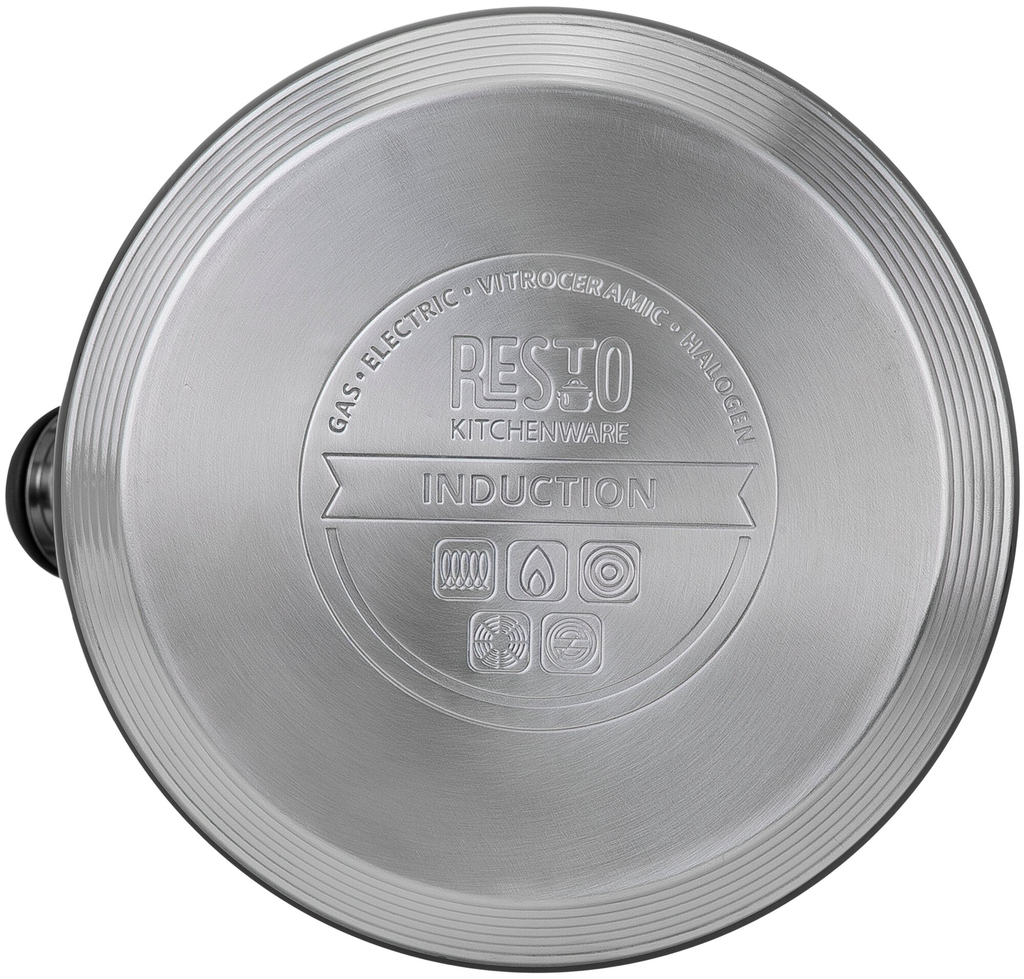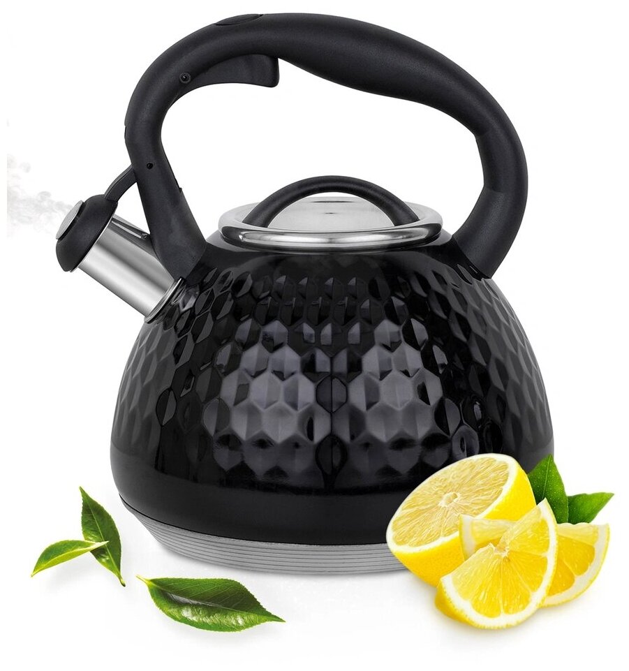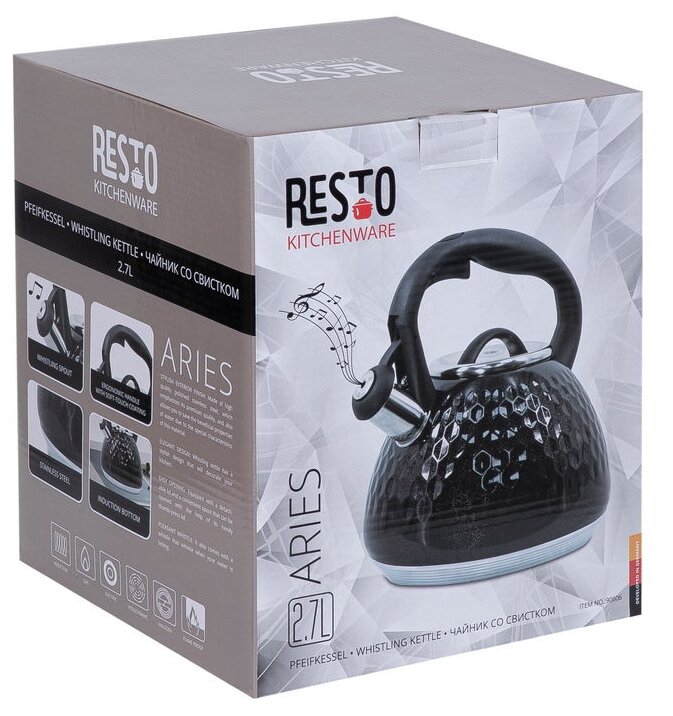 Чайник со свистком Resto позволяет кипятить воду на чугунных, газовых и индукционных конфорках. Он придётся по душе тем, кому нравится кухонная утварь, оформленная в стиле ретро. Им просто пользоваться, а благодаря ёмкости 2,7 л он подходит для чаепития в кругу семьи или дружеской компании.ВСЁ продуманоКорпус сделан из прочной нержавеющей стали. На него нанесено жаростойкое покрытие на водно-силиконовой основе: оно красиво выглядит и его сложно поцарапать. Эргономичная термоизолированная ручка изготовлена из бакелита.