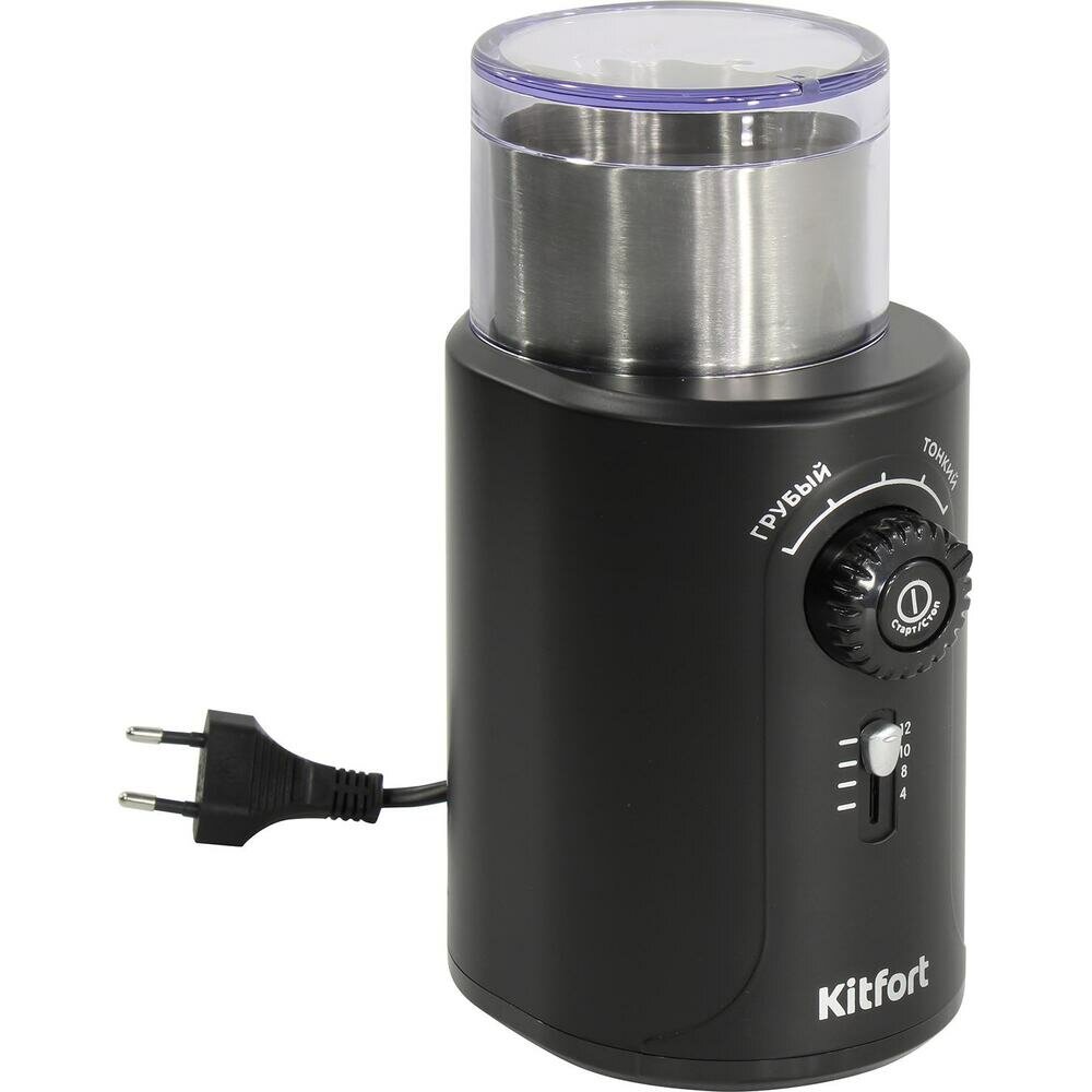 Kitfort Кофемолка Мощная кофемолка с электронным управлением предназначена для помола кофейных зёрен и измельчения специй и орехов. Это несложное в использовании устройство обязательно пригодится любителю кофе! Прибор оснащён регуляторами степени помола и количества чашек. Кнопка включения расположена на регуляторе степени помола. Защитный механизм не позволит включить кофемолку, если крышка установлена неправильно. В чаше установлен двухлезвийный нож-дробилка для эффективного измельчения зёрен кофе, специй или орехов. Кофемолка укомплектована съёмной чашей из нержавеющей стали и прозрачной крышкой, а на дне есть специальные прорезиненные нескользящие ножки.