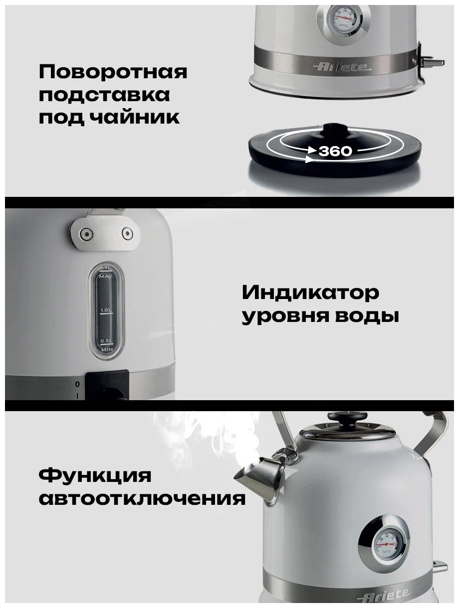 Чайник электрический Ariete 1.7 л White - это современный и удобный электрочайник, который станет незаменимым помощником в приготовлении горячих напитков.