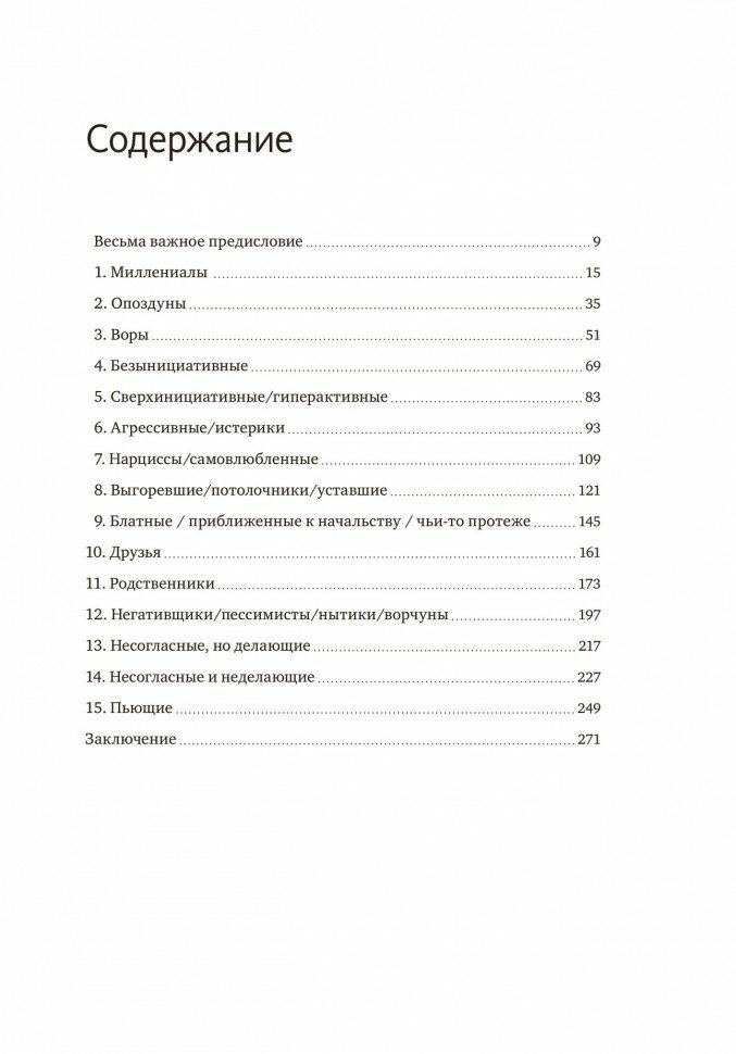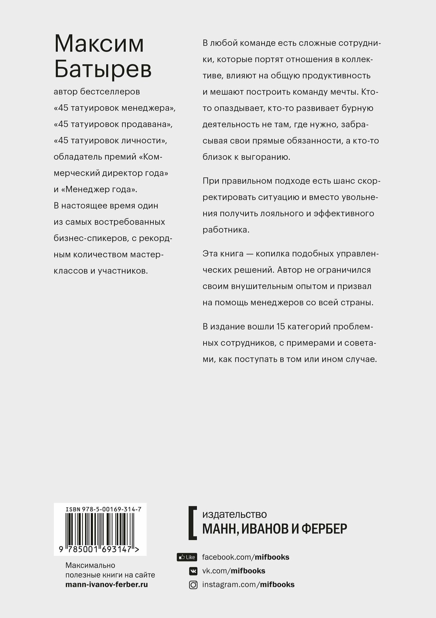 Перед тем как написать эту книгу, автор собрал и проанализировал несколько тысяч кейсов российских менеджеров. Получилось 15 категорий сложных сотрудников - от опоздунов и безынициативных до выгоревших и нарциссов. Это основные типы, которые встречаются в каждой компании. Батырев описывает их в книге и рассказывает, как с ними работать. Все советы проверены на практике.