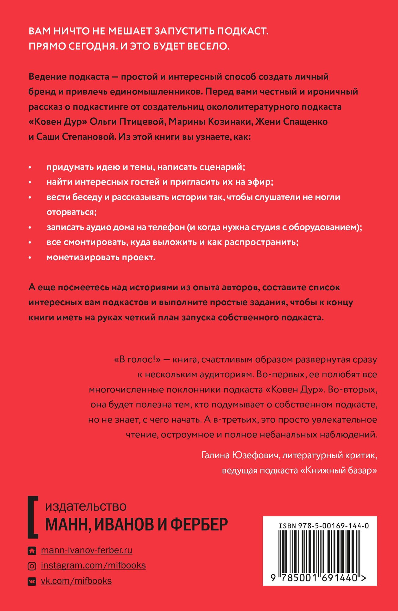 Если вам есть что сказать широкой аудитории, но вы не готовы вкладывать в это дело большие средства — книга «В голос!» для вас. Авторы окололитературного подкаста «Ковен дур» делятся секретами создания подкаста и развития личного бренда.