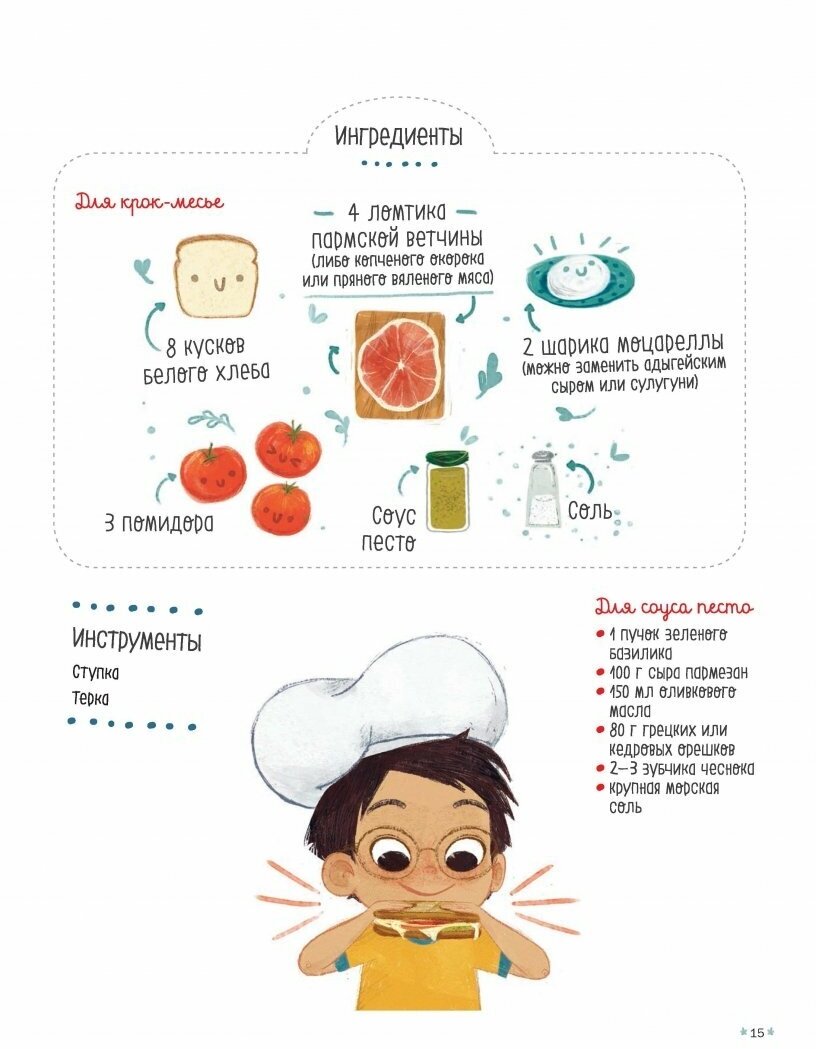 Эта книга - сборник необычных рецептов. Здесь вы найдете описания 20 простых блюд, которые сможете приготовить вместе с ребенком. При этом блюда оригинальные: вы удивитесь, когда поймете, что их с легкостью приготовит и ребенок. Превратите приготовление пищи в творческое занятие! Вот какие блюда научится готовить ребенок по этой книге. Завтраки и закуски * Яйца "Мимоза" * Гренки * Крок-месье по-итальянски * Соленые маффины * Сырное суфле Вторые блюда * Фаршированные помидоры * Розочки из кабачков * Весенние роллы * Фахитас с курицей * Запеченный лосось * Пицца "Маргарита" * Панированная рыба Десерты * Фрукты на шпажках * Морковный пирог * Шоколадный мусс * Пряный медовый кекс * Песочное печенье * Печенье с кусочками шоколада * Клубнично-банановое эскимо * Смузи Фишки книги Кулинарная книга для всей семьи. Интересные факты из истории блюд. Есть несколько вариантов приготовления каждого блюда. Пошаговые рецепты, которые научат ребенка готовить. В книге подобраны необычные блюда современной европейской кухни. Некоторые из них мы привыкли видеть скорее в кафе, чем на домашней кухне. Вы удивитесь, когда поймете, что их с легкостью приготовит и ребенок. Книга написана живым языком. Автор будто разговаривает с вами на кухне - все понятно, весело и интересно. Книга не только полезная, но и очень красивая! Как читать эту книгу Вместе с ребенком выбираете, какое блюдо будете готовить. Определяетесь с вариантом рецепта и приступаете к подготовке ингредиентов. Далее придерживайтесь пошаговой инструкции автора. В книге для каждого рецепта указано: количество порций, время "холодного" приготовления блюда, время тепловой обработки. К приготовлению каждого блюда нужно привлекать ребенка: он будет делать то, что ему по силам. Каждый пункт инструкции приготовления маркирован одним из значков: Д - делают дети, Р - выполняют родители, Д + P - делают дети с помощью родителей. Готовить вместе с детьми весело и увлекательно! Для кого эта книга Для всех любителей вкусно поесть от 5 лет и старше. Для родителей, которые хотят научить своих деток самостоятельности. Для детей, которые хотят порадовать родителей и друзей вкусными блюдами. Для фантазеров и мечтателей попробовать что-то вкусное, простое и необычное. Для родителей, которые хотят с пользой проводить время с детьми. Об авторе Элеонора Тэри - французский автор. Живет в Париже, пишет для журналов Le Journal des Arts, L'Oeil, M le Monde, Doolittle/Society & autres trucs, En relation libre. Элеонора издала несколько книг для детей и подростков. В своих произведениях затрагивает разные темы: как планировать время, как стать крутой IT-девчонкой, как понять искусство, как научиться готовить. 4-е издание.
