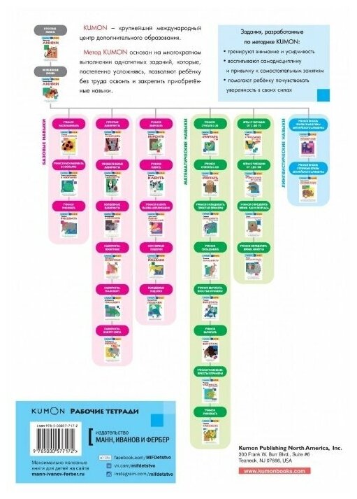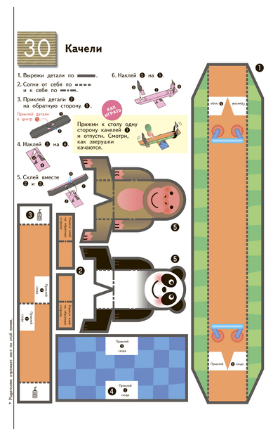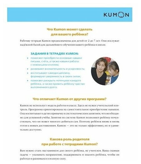 Эта рабочая тетрадь рассчитана на детей 5–7 лет, которые уже умеют пользоваться ножницами и клеем. В ней содержатся инструкции с картинками, по которым ваш ребёнок сможет собрать из бумаги забавные поделки. То, что бумажными поделками можно играть, особенно нравится детям!Для удобства на страницах тетради предусмотрены простые толстые линии для вырезания и широкие поля для нанесения клея. С каждой новой поделкой уверенность ребёнка в своих силах будет расти. Если какое-то задание окажется для ребёнка сложным, предложите ему свою помощь.Тетрадь способствует развитию мелкой моторики и пространственного мышления.Как работать с этой тетрадью:Выбирайте ножницы так, чтобы их размер и вес подходили вашему ребёнку.Линия у корешка нарисована специально для родителей. Отрежьте по этой линии страницу с помощью ножниц или ножа для бумаги и дайте её ребёнку, чтобы он мог выполнить задание.В заданиях предусмотрено два вида линий для сгиба. Объясните ребёнку, чем они отличаются друг от друга. Если у него не получается самостоятельно сгибать детали по линиям, покажите, как это делать.Если вашему ребёнку трудно сложить лист, проведите по линии сгиба шариковой ручкой, которая уже не пишет, или любым другим подходящим предметом.Эта книга напечатана на плотной бумаге хорошего качества специально для того, чтобы вашему ребёнку было удобнее учиться вырезать и чтобы поделки получались прочнымЧто такое KUMON?KUMON — это крупнейший международный центр дополнительного образования. Сегодня по программам KUMON обучаются в 48 странах более 4 млн детей и подростков в возрасте от 2 до 17 лет.Рабочие тетради KUMON для дошкольников помогут вашему ребёнку приобрести навыки письма, счёта, а также научат его работать с ножницами и клеем.