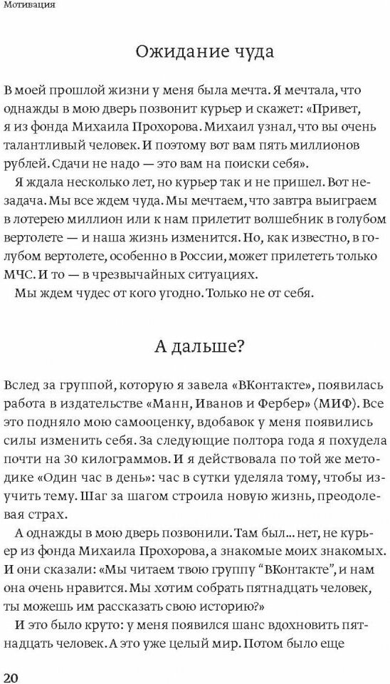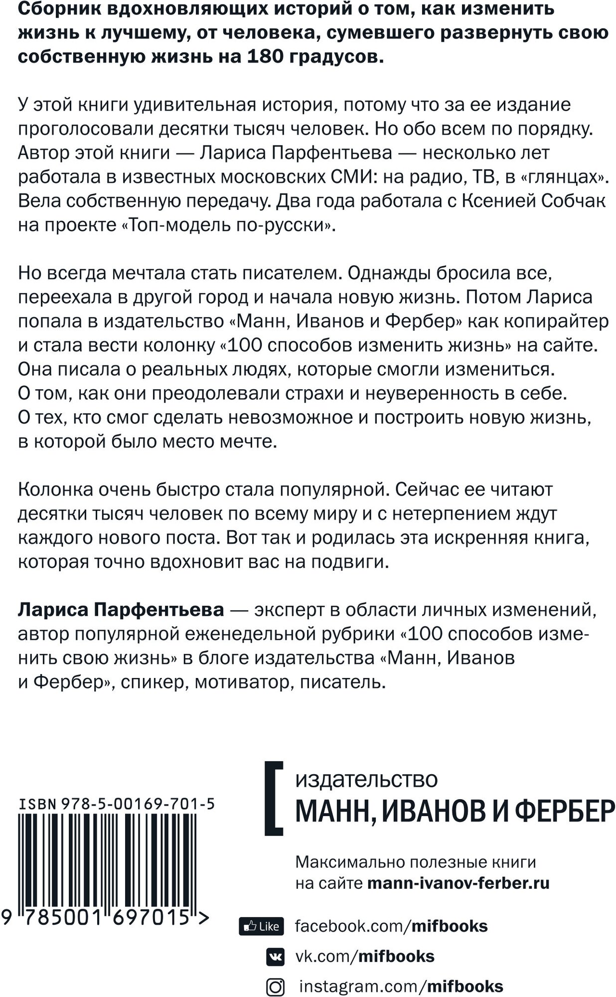 Сборник вдохновляющих историй о том, как изменить жизнь к лучшему, от человека, сумевшего развернуть свою собственную жизнь на 180 градусов. Эта книга родилась из еженедельной рубрики Ларисы Парфентьевой 100 способов изменить свою жизнь" на сайте издательства "МИФ". Только появившись, эта рубрика вызвала много откликов. Люди стали писать о том, как разные истории помогают им двигаться вперед. В эту книгу вошли разделы "Предназначение", "Мотивация", "Движение", "Законы жизни". В ней вы найдете ответы на многие вопросы. Как выразить силу, которая есть у меня внутри? Как уйти с нелюбимой работы и реализовать себя? Как сделать первый шаг к новой жизни? Как преодолеть страхи и совершить "прыжок веры"? Как совмещать работу и любимое дело? Как найти окружение, которое поддержит? Как развить личную силу и получить желаемое от Вселенной? Как простить старые обиды и "вынуть нож из спины"? Кроме того, вы получите персональную формулу счастья из 7 составляющих."