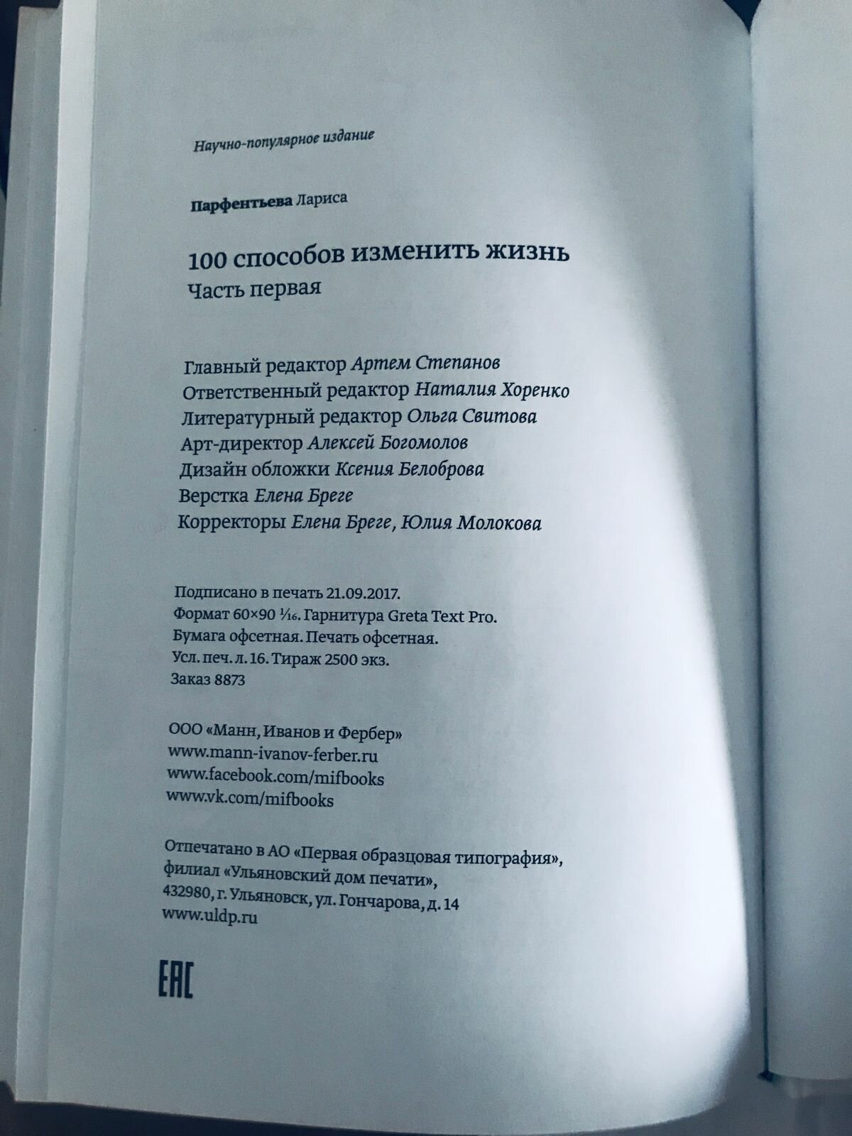 100 способов изменить жизнь (Лариса Парфентьева); МИФ, 2016