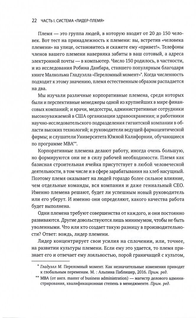 Увлекательная и прорывная книга, которая поможет создать сильную корпоративную культуру. Эта книга открывает нам глаза на один столь повсеместно распространенный факт: человеческие существа сбиваются в племена. Логан, Кинг и Фишер-Райт анализируют связь между племенами и теми, кто ими руководит. Авторы доказывают, что эта связь поднимает важные вопросы о том, как развиваются лидеры, как они становятся великими и какое наследие они оставляют. Выстраивая свое племя, лидер развивает его. Этот процесс, в свою очередь, оказывает влияние и на самого лидера. Подчиняя себя племени, он добивается такого величия, которое, казалось бы, недоступно отдельной личности. Книга - результат десятилетних полевых исследований с участием 24 тысяч человек из двух дюжин организаций. Но вместо того чтобы засыпать нас цифрами и таблицами, авторы нашли и описали людей, которые олицетворяют собой их идеи и открытия. В результате книга получилась одновременно и информативной, и увлекательной. Они выяснили, чем именно отличаются посредственные корпоративные племена от племен с высокоразвитой культурой. Более того, они обнаружили, что культура племен развивается поэтапно, переходя от одного уровня к другому: от разрушительной агрессивности и эгоцентричности к командному творчеству. Эта книга объясняет нам, почему некоторые племена отвергают любые разговоры о ценностях, характерах и благородстве, в то время как другие буквально требуют проведения таких дискуссий. Книга дает ответы еще на несколько занимательных вопросов. Почему выдающиеся лидеры нередко терпят поражение, попадая в новую среду? Почему средненькие лидеры порой кажутся лучше, чем они есть на самом деле? Почему классные стратегии чаще проваливаются, чем срабатывают? Авторы доказывают, что ответ кроется во взаимоотношениях между лидером и племенем. Великие лидеры строят великие племена, которые способны на великие дела, так как отдают должное своим великим лидерам.