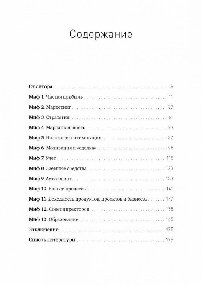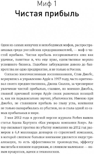 Хороших книг о российском бизнесе не так много. Эта книга хорошая. В книге автор четко разложил каждый миф. В книге автор описывает каждый миф и дополняют их собственными примерами. На мой взгляд книга прекрасна ещё и тем что в ней все расписано без воды. Это прекрасное руководство по менеджменту. Возможно людям работающим в найме она покажется бесполезной в данный момент их жизни, но кто знает как ваша жизнь повернется дальше и данные знания вам очень пригодятся