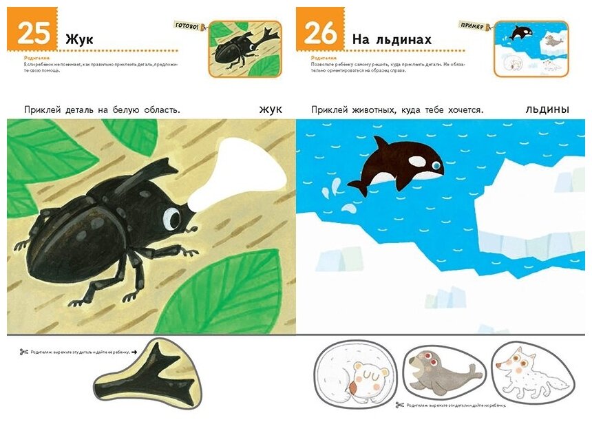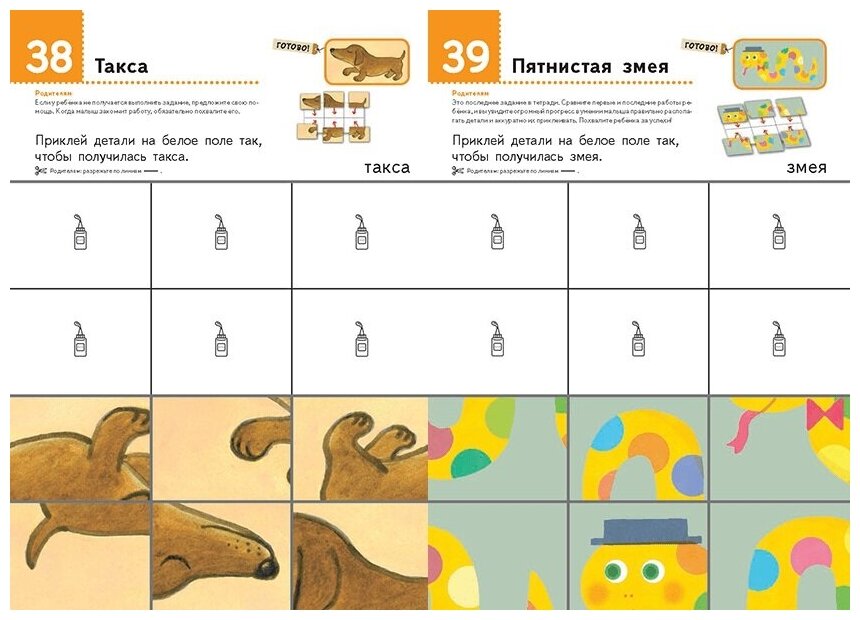 Этот сборник заданий является первой ступенью методики индивидуального обучения KUMON. Занимаясь по тетради, ребёнок потренирует пространственное мышление и творческие способности, научится координировать работу пальчиков, а также поймет, что такое форма, цвет и размер. Дети, которые уже работали с тетрадью "Давай клеить!", смогут закрепить и развить приобретенные навыки. Сначала ребёнок будет играть с наклейками, как хочет, потом научится приклеивать их на участки определённой формы, а после этого перейдёт к работе с клеем. Параллельно с тетрадью "Давай клеить! Забавные животные" можно: осваивать навык работы с ножницами по тетради "Учимся вырезать"; учиться закрашивать фигуры и рисовать по тетради "Учимся рисовать"; начать знакомиться со счётом по тетради "Учимся считать от 1 до 30". Серия «Первые шаги» разработана для детей от 2 лет. Задания в тетрадях направлены на развитие мелкой моторики рук, а также навыков работы с ножницами, клеем и восковыми карандашами. Важно! Рекомендуемый возраст на тетради указан для ориентира. Выбирайте пособие, учитывая индивидуальные особенности ребенка: может ваш малыш младше 2 лет, но уже готов к занятиям с восковыми карандашами или старше, но ему не помешает дополнительная тренировка мелкой моторики.