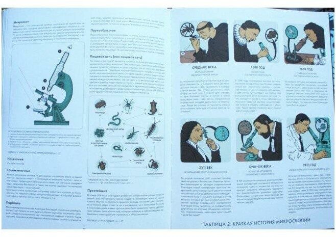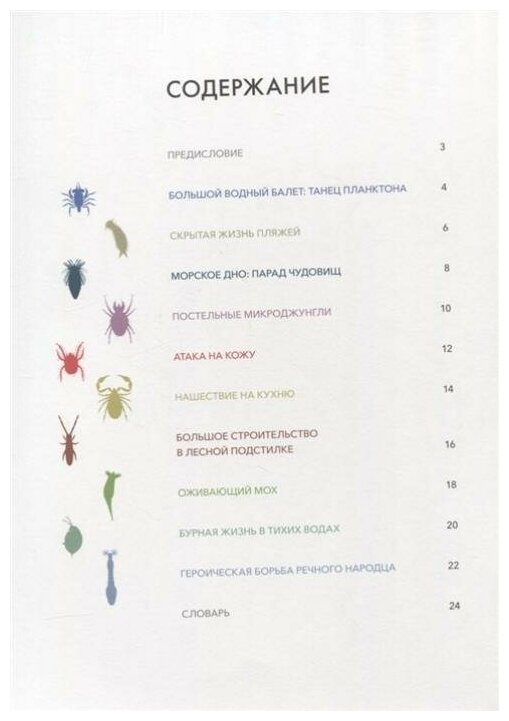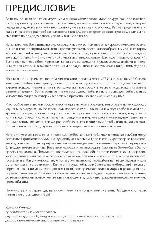 Повсюду, где бы мы ни оказались, нас окружают невидимые миры. Населяющие их животные такие крохотные, что их невозможно увидеть невооруженным глазом. И тем не менее они есть везде - на поверхности океана и морском побережье, в лесной подстилке и на кухне у нас дома, в постельном белье и даже на нашей собственной коже. Благодаря кипучей деятельности этих микроскопических существ на планете поддерживается природное равновесие. Книга позволяет не только прочитать о них, но и подробно их рассмотреть. На красочных раскладных страницах с большим увеличением и в масштабе показаны обитатели десяти микроэкосистем. Микроскопические существа изображены очень реалистично, как если бы вы разглядывали их в микроскоп. Как читать эту книгу Книга состоит из 10 глав, посвященных жителям десяти микроместообитаний. Главу открывает краткое описание экосистемы. Далее в масштабе изображена жизнь в капельке морской воды и крохотном образце грунта со дна Атлантического океана; в комочке песка с пляжа, частичке лесной подстилки и веточке мха из умеренных широт; в капельке стоячей воды и в капельке чистой речной воды из умеренных широт, а также в образцах из постели, с кожи и с кухни человека. У каждого обитателя есть описание, а в конце книги вы найдете словарь и схема устройства микроскопа. Фишки книги Необычная яркая тема увлечет даже взрослого; Откроет невероятный незримый мир и его обитателей: от капли воды до кожи человека; Красивые сочные яркие разворотные иллюстрации; Книга состоит из 10 глав, посвященных жителям десяти микроместообитаний; У каждого обитателя имеется описание, составленное со скрупулезной научной точностью, и номер, по которому его легко отыскать на рисунке; В конце есть словарь, где разъясняются сложные понятия и термины, краткая история микроскопии и схема устройства микроскопа, даются таблицы с точными портретами клещей и простейших, представленных в книге. Для кого эта книга Для детей от 7-ми лет. Для любопытных любого возраста. Об авторах Элен Ражкак - художник-иллюстратор. Родилась в Париже в 1981 году. Закончила Национальную высшую школу прикладных искусств, изучала технику гравюры в Школе искусств и полиграфии, занималась дизайном тканей. Дамьен Лавердан - писатель и иллюстратор-график, преподаватель прикладного искусства в парижском лицее. Родился в 1978 году в Париже. Учился в Высшей школе прикладных искусств Дюперре, получил диплом Национальной высшей школы прикладных искусств. Объединившись, Элен Ражкак и Дамьен Лавердан создали арт-дуэт Tigres Gauchers ("Тигры-левши"), и уже стали авторами нескольких успешных книг для детей и подростков.