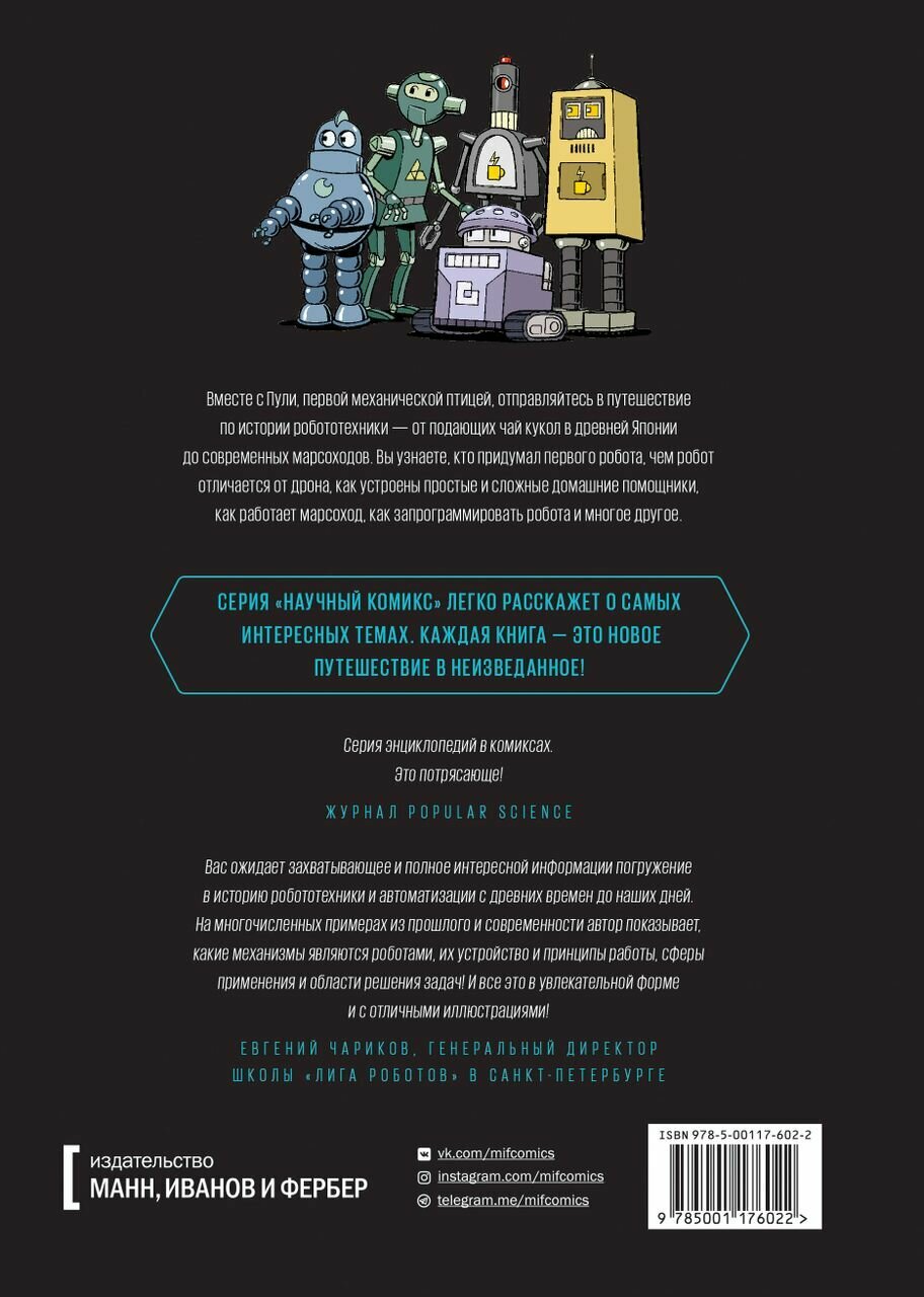 Вместе с Пули, первой механической птицей, отправляйтесь в путешествие по истории робототехники — от подающих чай кукол в древней Японии до современных марсоходов. Вы узнаете, кто придумал первого робота, чем робот отличается от дрона, как устроены простые и сложные домашние помощники, как работает марсоход, как запрограммировать робота и многое другое.