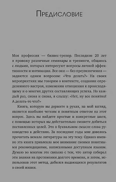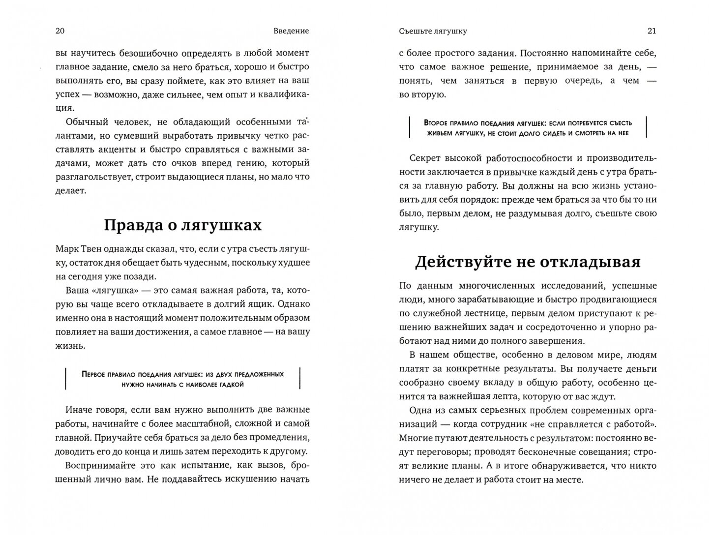 О чем эта книга Книга № 1 по саморазвитию. Она переведена на 40 языков. Куплено более 1 200 000 экземпляров. С этой книги начался мировой успех Брайана Трейси - одного из ведущих специалистов в мире по личному развитию. В книге представлен результат более чем тридцатилетнего изучения вопросов распределения времени. Она рассказывает том, как добиваться решения сложных задач, выходя из зоны комфорта. Ранее книга выходила в издательстве "Попурри" под названием "Оставьте брезгливость, съешьте лягушку!" Для кого эта книга Книга представляет интерес для любого, независимо от рода занятий, хотя в первую очередь автор обращается к тем, кого принято называть деловыми людьми. Почему мы решили издать эту книгу Галилей когда-то написал: "Человека нельзя ничему научить, можно лишь помочь ему найти это в себе". Практические советы, данные в книге, позволят обнаружить резервы, о которых вы и не подозревали, и правильно определять приоритеты своих дел, грамотно планировать распорядок дня, всегда работать с максимальной отдачей. Фишки книги В книге вы найдете 21 практический совет, который можно применить немедленно. 11-е издание.
