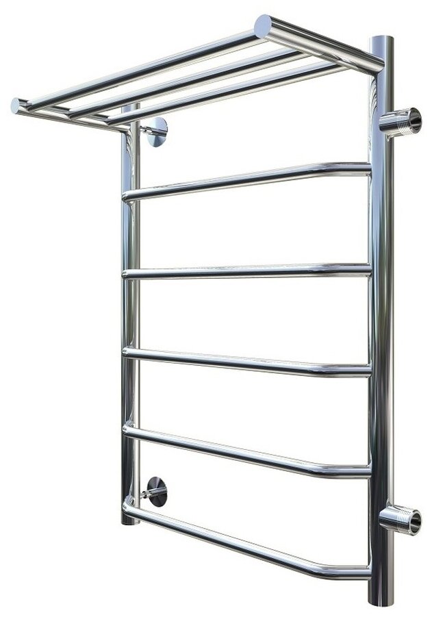 Полотенцесушитель типа "лесенка" с боковым подключением трапецевидными вставками с полкой. Серия 1 предполагает равномерное размещение вставок. Полотенцесушитель имеет наружнюю резьбу на боковых выводах. В комплекте имеются заглушка с краном маевского и телескопические держатели.