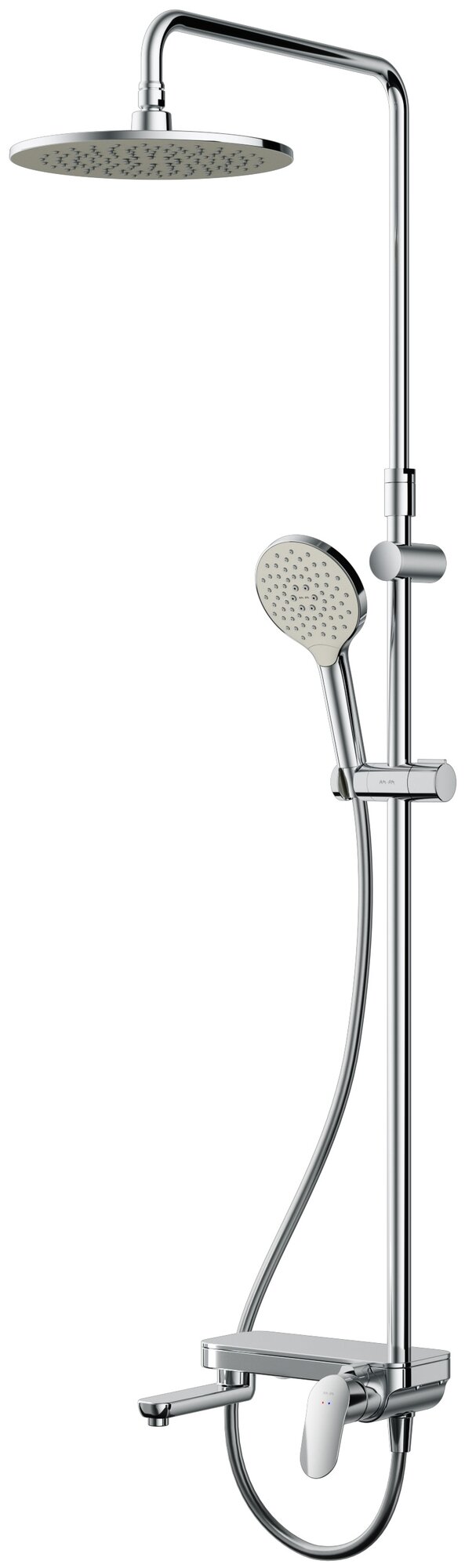 | Комплектация | Штанга, держатели штанги, верхний душ, лейка, шланг, держатель ручного душа, полочка, смеситель для ванны и душа, эксцентрики, комплект креплений, инструкция |
