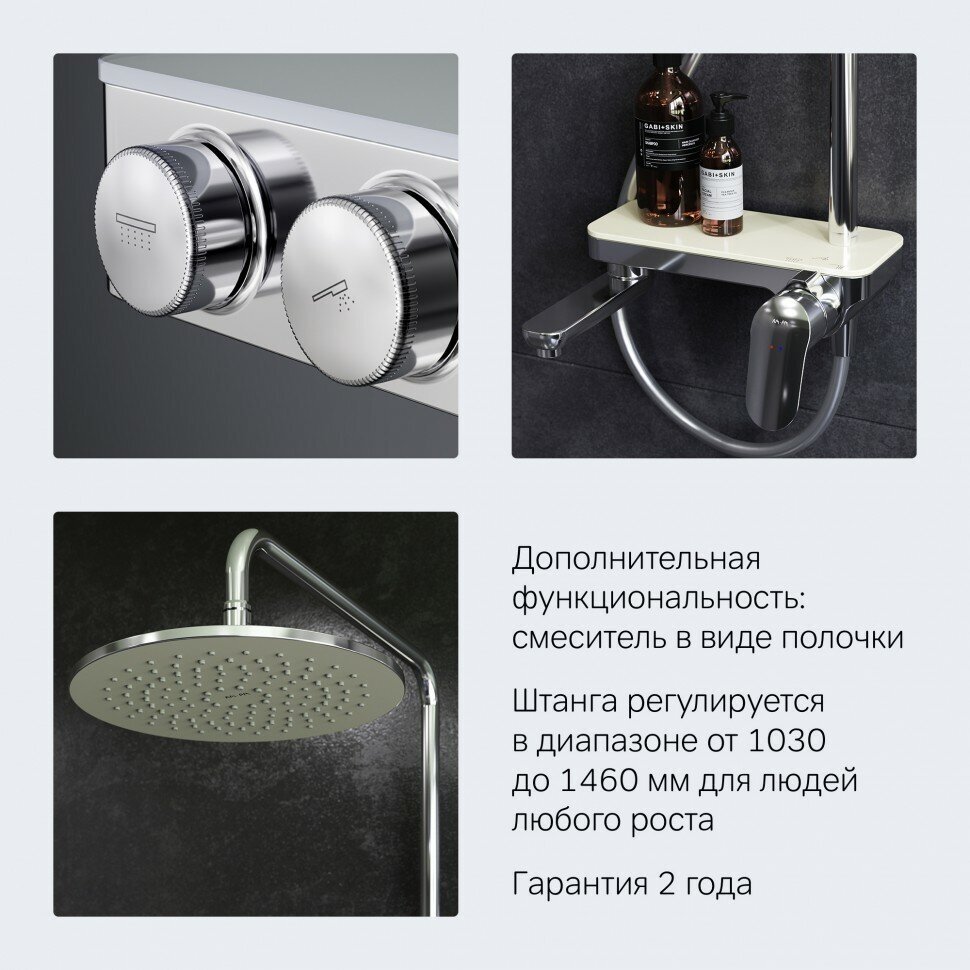 Изделие выполнено в современном стиле, имеет глянцевое покрытие в цвете хром. Душевая система оснащена встроенным поворотным изливом для наполнения ванны, который может органично складываться, предоставляя больше пространства для принятия душа. Душевая штанга имеет диапазон регулировки по высоте 103-146 см, обеспечивая необходимый комфорт для людей любого роста, а шарнир в держателе верхнего душа позволяет регулировать угол его наклона. Встроенная полка позволяет размещать на ней необходимые атрибуты для принятия водных процедур.