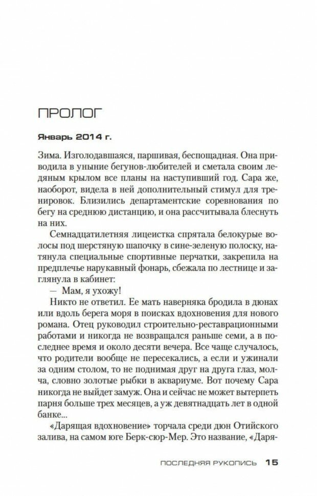 Дорожная авария в окрестностях Гренобля: юноша, удирая на автомобиле от таможенных контролеров, врезался в парапет и погиб. Подоспевшие полицейские обнаружили в багажнике тело девушки. Без лица. Так начинается новый роман Франка Тилье «Последняя рукопись», напоминающий хитроумно выточенную матрешку, где одна загадка сменяет другую. Главная линия связана с Лин Морган: скромная учительница, ставшая королевой триллера, всегда держала личную жизнь в секрете, но эта прежняя жизнь – спокойная, счастливая – обратилась в прах с исчезновением семнадцатилетней дочери. Лин вынуждена покинуть прекрасную виллу на Опаловом берегу, расстаться с мужем. Но спустя четыре года раздается телефонный звонок и ей сообщают, что муж в больнице. Более того, после совершенного на него нападения он потерял память…