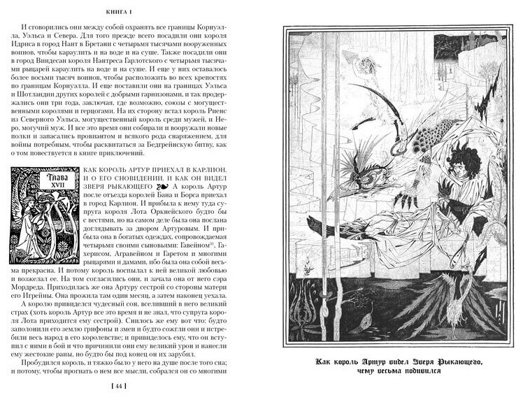 Роман Томаса Мэлори «Смерть Артура» — один из самых впечатляющих символов Англии, ее славного, благородного прошлого. Невозможно представить английскую (да и мировую тоже!) культуру без отважного короля Артура, мудрого волшебника Мерлина, верного Ланселота Озерного, коварной Феи Морганы, печальных влюбленных Тристрама и Изольды… Эпоха рыцарства, безвозвратно канувшая в прошлое, оживает на страницах книги, очаровывая читателей по всему миру вот уже более пяти веков. При этом каждый век оценивает приключения рыцарей по своему, образ их волшебного, зачарованного мира изменяется, согласно современным представлениям о прекрасном. Так в 1892 появились иллюстрации Обри Бердслея, которые принесли художнику широкую известность. В картинах, рожденных пером Бердслея, воскресает изящный мир эпохи декаданса, странным образом сочетающийся с древними сказаниями о приключениях рыцарей Круглого стола.