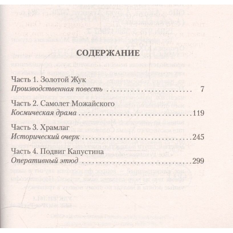 Роман состоит из четырех взаимосвязанных частей: производственная повесть "Золотой жук", оформленная как мемуар финансового аналитика Кримпая Можайского, нашего современника; космическая драма "Самолет Можайского", в которой описываются битвы вселенского масштаба, разворачивающиеся в подвале усадьбы скромного отставного офицера Маркиана Можайского; исторический очерк профессора Голгофского "Храмлаг", основанный на донесениях Мафусаила Можайского, о возведении масонского Храма Соломона за колючей проволокой; и, наконец, оперативный этюд "Подвиг Капустина", где действие почти полностью вынесено в сновидение героя.