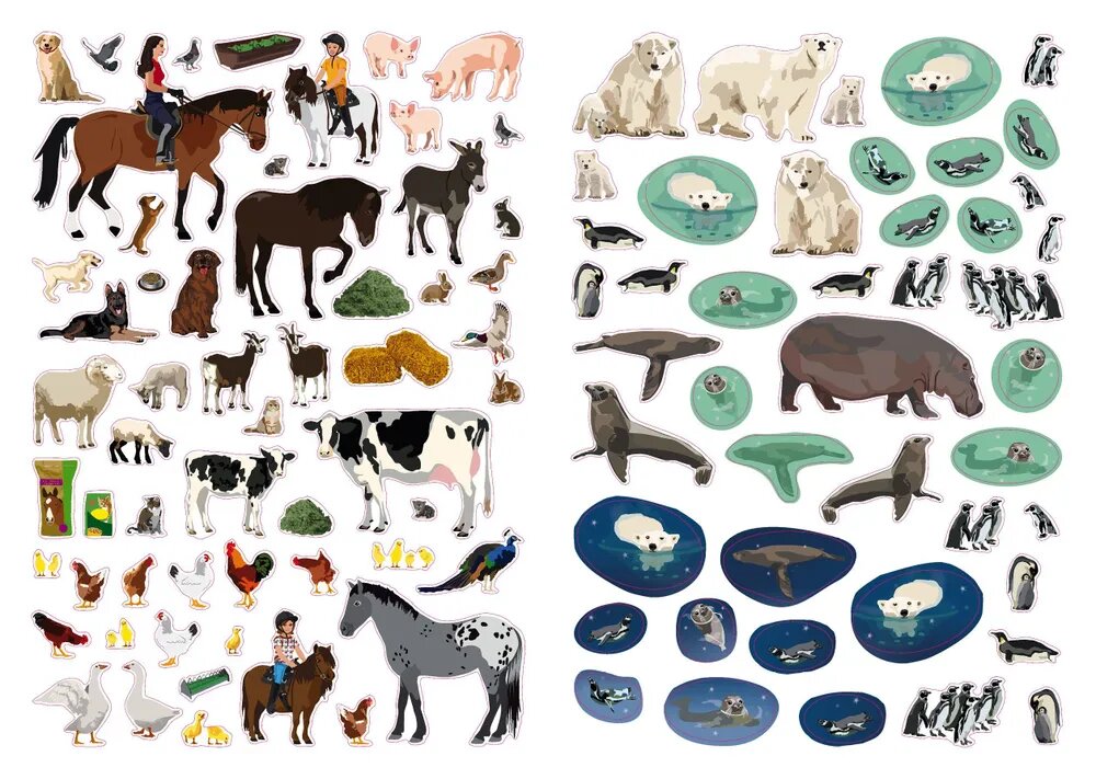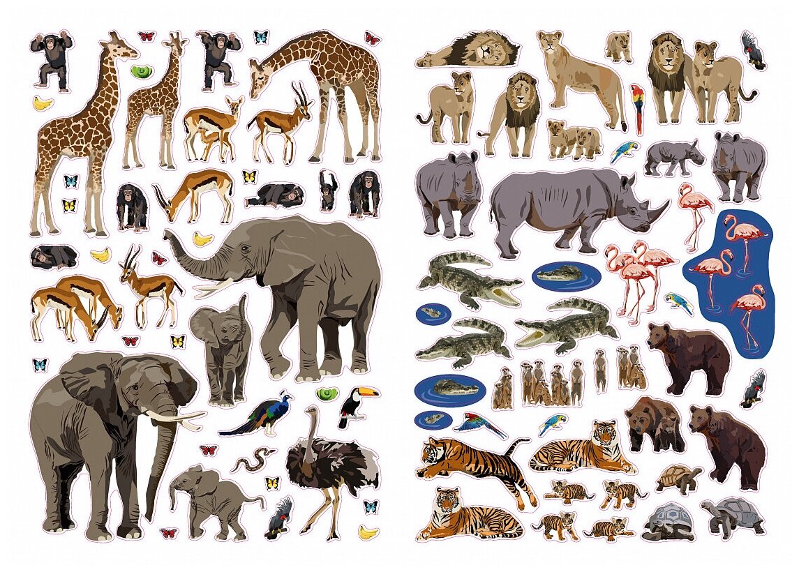 Оживи с помощью более 400 ярких наклеек развороты книги, насели их обезьянами и слонами, зебрами и пингвинами, экзотических рыбами и домашними животными.