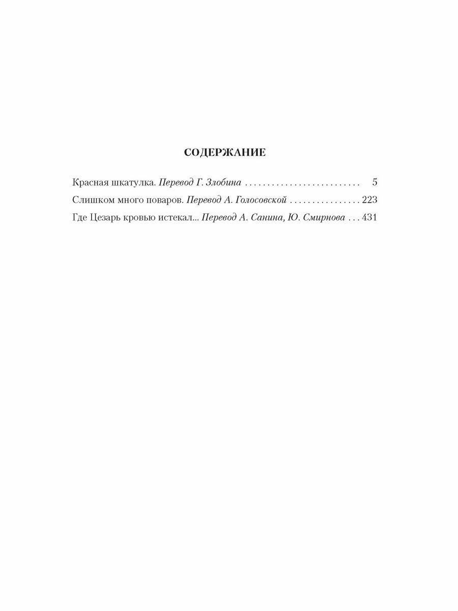 Отравлены три человека, причем один в кабинете Вулфа. Чтобы найти убийцу, надо отыскать красную шкатулку, но где эта шкатулка, никому не известно… На встрече пятнадцати лучших в мире поваров убивают одного знаменитого повара. Вулфу брошен вызов - и как детективу, и как завзятому гурману. Еще одно дело, которое Вулф расследует вне дома. Страсти разгораются вокруг бесценного племенного быка. Происходят два убийства подряд, в одном подозревается бык, во втором - Арчи Гудвин...