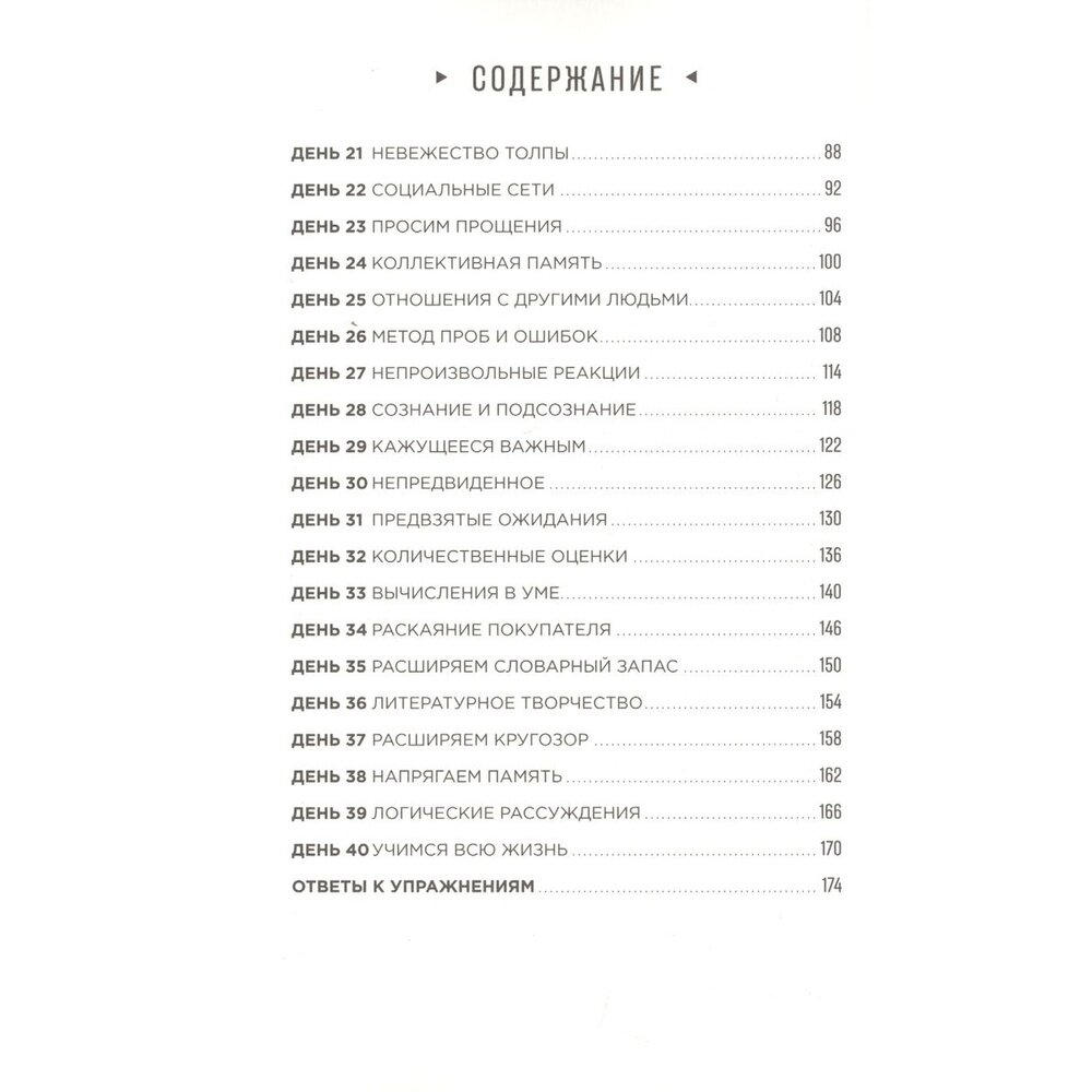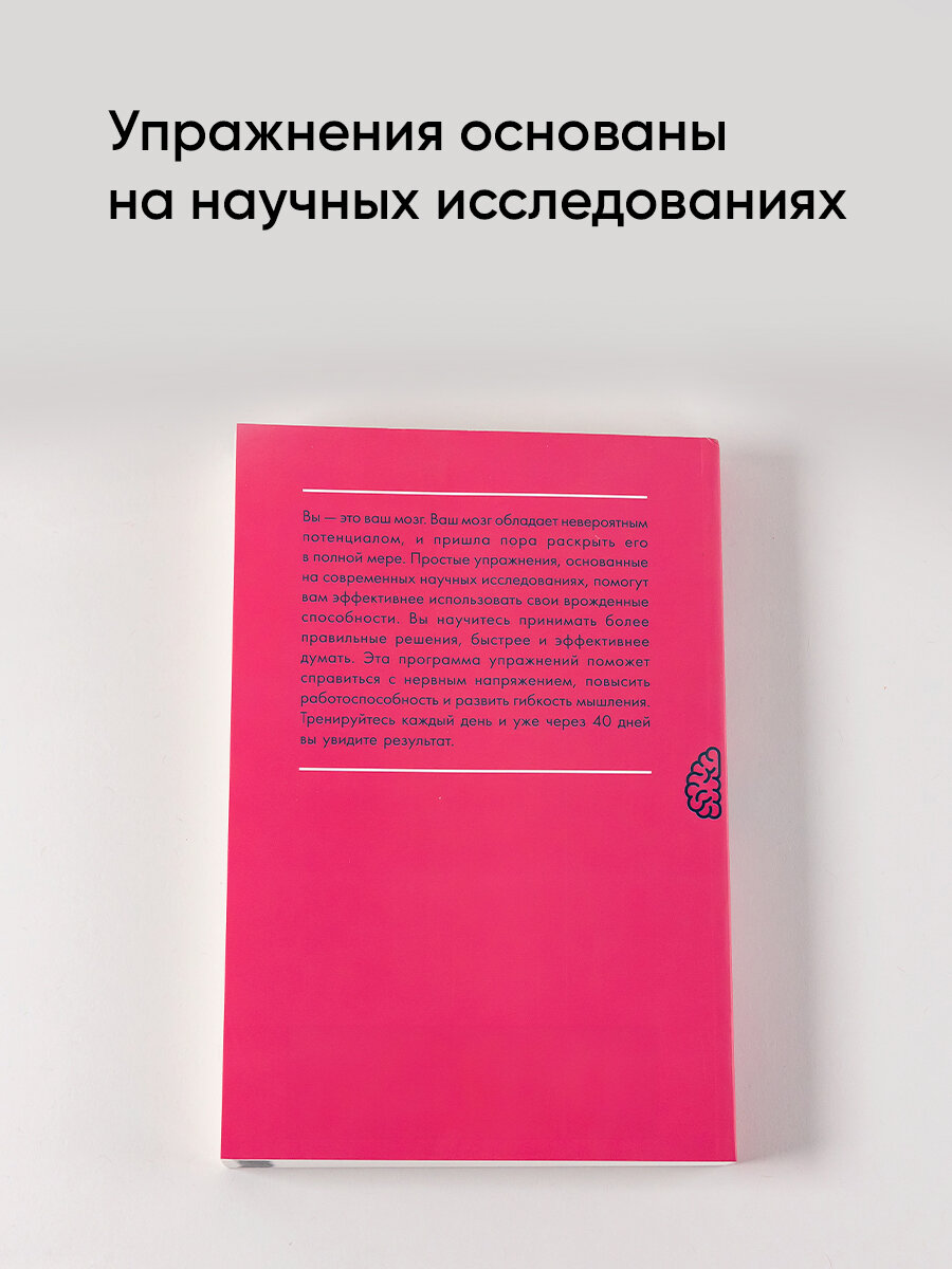Вы — это ваш мозг. Ваш мозг обладает невероятным потенциалом, и пришла пора раскрыть его в полной мере. Простые упражнения, основанные на современных научных исследованиях, помогут вам эффективнее использовать свои врожденные способности. Вы научитесь принимать более правильные решения, быстрее и эффективнее думать. Эта программа упражнений поможет справиться с нервным напряжением, повысить работоспособность и развить гибкость мышления. Тренируйтесь каждый день, и уже через 40 дней вы увидите результат.