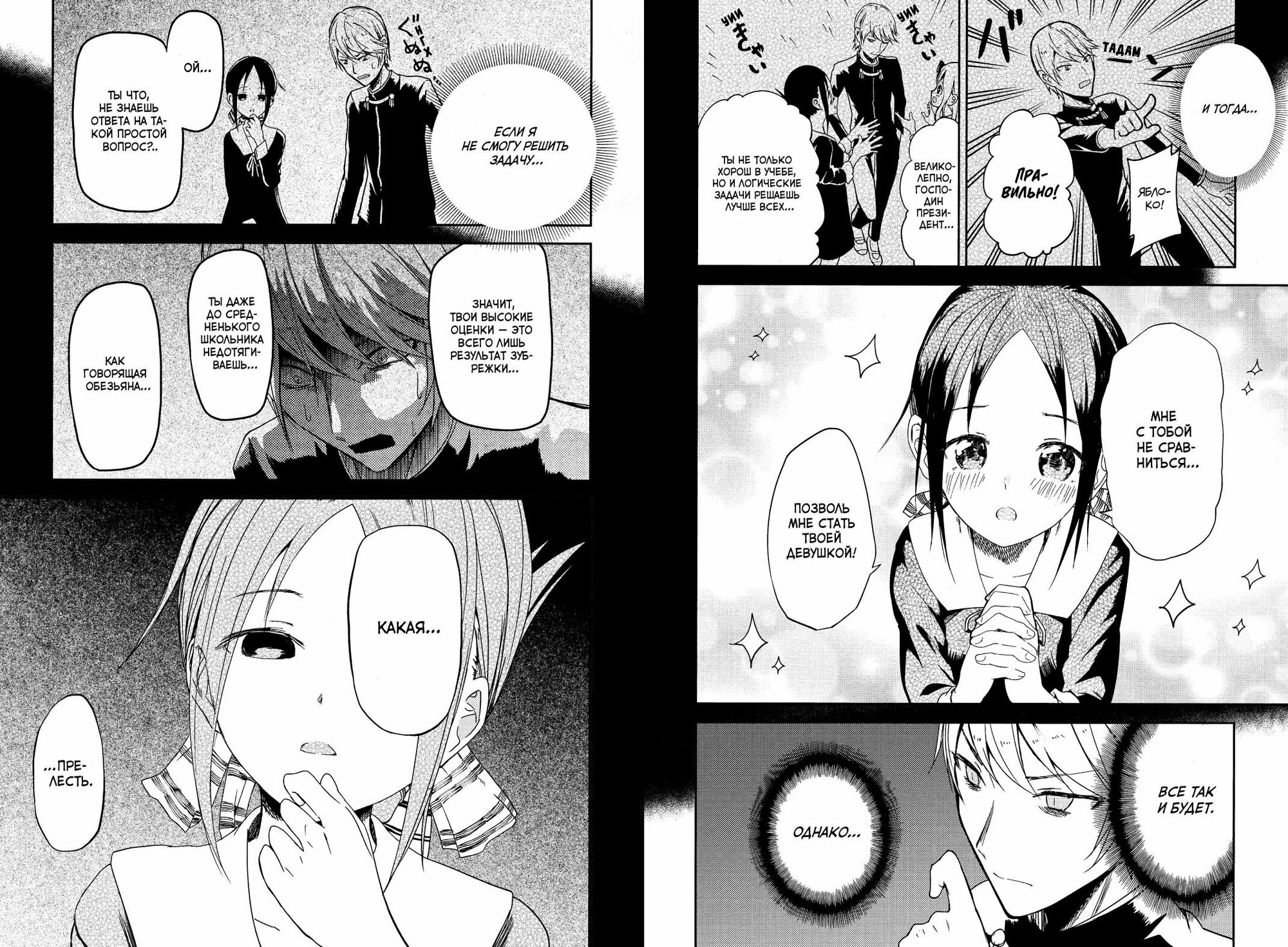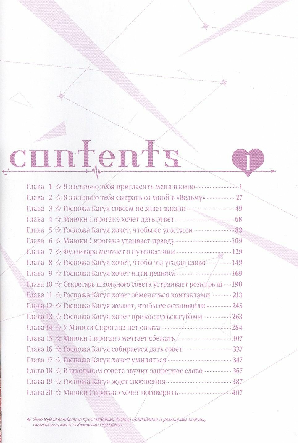 Знатное происхождение и безупречное воспитание - этим славятся учащиеся академии Сютиин. Кагуя Синомия и Миюки Сироганэ - представители талантливой молодежи, будущего Японии. Они познакомились во время выборов правления школьного совета и с тех пор работают вместе. Никто не сомневался, что между молодыми людьми вспыхнут чувства, но минуло полгода, а ничего так и не произошло! Каждый из них оказался слишком горд для того, чтобы сделать первый шаг. Бесконечные уловки, загадки, стратегии и планы, призванные во что бы то ни стало заставить партнера сделать признание... Вот она, любовная битва двух гениев! Интересно, кто же выйдет из нее победителем?