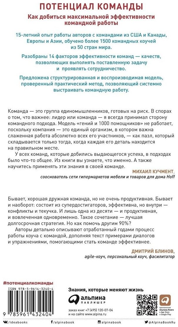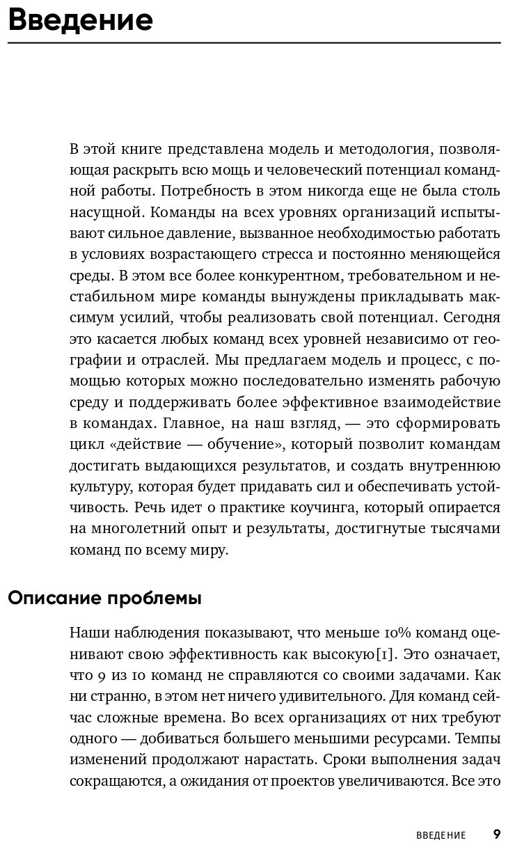 Авторы книги, опираясь на 15-летний опыт работы с командами, разработали структурированную и понятную модель, проверенный практический метод, позволяющий системно выстраивать командную работу. Они исследовали 14 факторов эффективности команд — качеств, позволяющих выполнять поставленную задачу и проявлять сотрудничество, — и создали воспроизводимую модель работы, основанную на принципах командного коучинга.