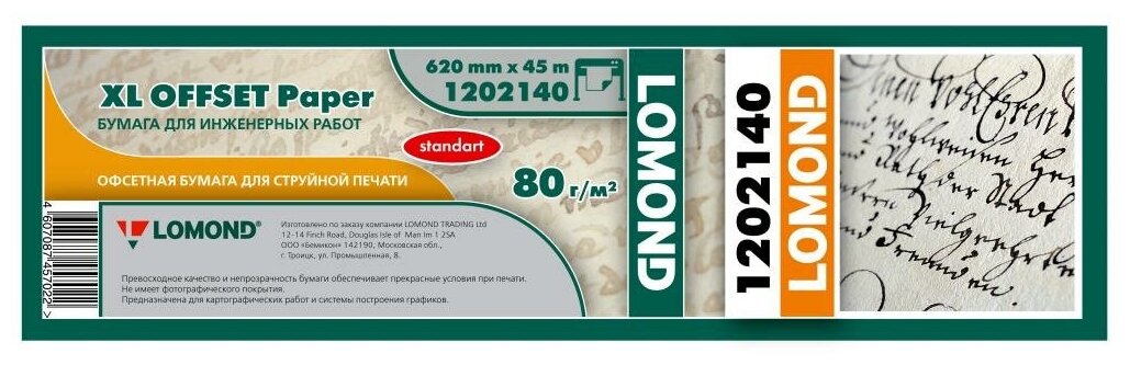 Плотность бумаги составляет 80 гр/м2, что позволяет её использовать практически во всех печатающих устройствах. Поставляется в рулоне шириной 620 мм и длинной намотки 45 м.